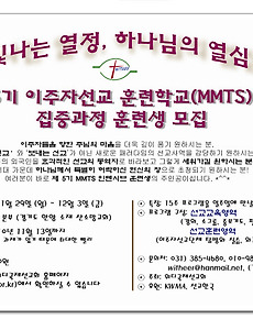 분류 전체보기805 Dr. Sadili Joy Tira 초정 '세계 디아스포라 선교' 특강 2011년 새해를 맞이하여 그간 준비하였던 MMTS(MMS)수료생들을 위한 심화강의를 로잔 디아스포라분과장을 맡고 계시는 Dr. Sadli Joy Tira를 초정하여 '세계디아스포라선교'라는 주제를 가지고 특강을 준비하였습니다. MMTS(MMS)수료생들께서는 이 기회를 놓치지 마시고 꼭 참석하시어 사역에 큰 도움이 되시기를 바라며, 향후 국내 이주자 선교와 세계디아스포라선교에 대한 도전과 비전를 보는 귀한 시간이 되기를 바랍니다. * 일시 : 2011년 1월 25일 (화) 오후 7시 * 장소 : 한국위디국제선교회(안양시 관양동 1385-6) Joy Tira 박사 프로필 Motivating, equipping, and mobilizing the people on the move the diasporas I.. 2011. 1. 12. 5기 이주자선교훈련학교(MMTS) 인텐시브 과정의 대단원의 막을 내렸습니다...^^ 2010년 11월 29일 부터 12월 3일까지 있었던 5기 이주자선교훈련학교(MMTS) 인텐시브 과정의 대단원의 막을 내렸습니다 4박 5일간의 숙박 과정을 모두 마쳤습니다...^^ 9명의 훈련생 분들이 참여를 하시어 수료하셨고 발런티어 섬김이 분들도 많이 수고 하셨습니다...^^ 주님의 은혜 가운데 유익한 모든 강의와 실습도 잘 마치었고... 은혜롭고 따듯한 가운데 잘 마치게 되어 주님께 감사드립니다...^^ 2010. 12. 9. 미션나가2011 조직위원회 구성되다!! 미션나가 2011 대회를 위한 조직위원회가 구성되었습니다. (홍보팀/문서제작팀/데코레이션 팀/중보기도팀/진행지원팀/강사섭외팀) 오래전 하나님이 열방을향한 선교의 전초기지로 나가랜드를 숨기우셨고 또 이제 그 일을 일으키기 위한 운동을 그곳 젊은이들을 통해 일하실텐데 이일에 기도로 함께 동역해주시고 또 재능으로 선교에 동참해주십시요. 문의) 위디국제선교회 : 031-468-9191 2010. 11. 19. 미션나가2011 배너 미션나가2011 배너 2010. 11. 12. 5기 이주자선교훈련학교(MMTS) 인텐시브 과정 지원서 5기 이주자선교훈련학교(MMTS) 인텐시브 과정 지원서입니다.... 작성하시고 이메일(witheer@hanmail.net)로 보내주세요...^^ 2010. 10. 22. (연장모집) 5기 이주자선교훈련학교(MMTS) 인텐시브과정 훈련생을 모집합니다. ◉ 기간: 2010년 11월 29일 (월) ~ 12월 4일 (토) ◉ 목적: 이주자선교 헌신자 및 사역자에게 이론과 실제를 겸비한 이주자선교 교육 및 훈련을 받게 하므로, 이주자 선교사역을 위한 기본적인 소양을 겸비케 한다. ◉ 대상: 이주자선교사역 헌신자 및 사역자로 이주자선교사역에 직,간접적으로 참여하기 원하는 모든 이들 (특히 인텐시브 훈련은 지방거주자 및 상반기 정규 코스를 하기 힘든 분들을 우선적으로 접수받습니다.) ◉ 장소: 위디선교회 안양 본부 (산소망교회) ◉ 특징: 15주 프로그램을 일주일에 만날 수 있는 시간! ◉ 프로그램 구성: 선교교육영역 (강의, 소그룹, 중보기도, 필독서, 재한이주자연구) 선교훈련영역 (이주자선교단체 탐방과 실습, 외국인전도, 영어복음암송) ◉ 강의구성:① Int.. 2010. 10. 14. 이전 1 ··· 63 64 65 66 67 68 69 ··· 135 다음