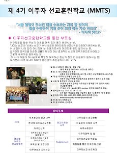 분류 전체보기805 4기 MMTS 지원서와 지원동의서, 안내자료 올립니다^^ 훈련생으로 지원시 사용하시면됩니다. 지원서와 지원동의서는 작성하셔서, 우편이나 메일로 보내주시구요. 안내자료는 읽어보시면 되겠네요. ^^ 2010. 1. 19. 위디소식지 2010.01월호 안녕하세요, 위디국제선교회입니다. 2010년도 1월호 소식지가 나왔습니다. -칼럼: 주님의 이름을 힘 입어... -Christian Bible Church of Valenzuela 수보편지 -일본지부 설립 정탐기 -선교편지 -매스컴을 통한 이주자 소식 -총회보고 -선교간증 등이 실려 있습니다. 2010. 1. 12. 안양 군포 의왕 산본 지역 기도합주회(2/23) 영적 각성과 지성명령성취를 위한 연합 중보 기도 운동 기도 합주회 매월 셋째 주일 후 화요일 7시 (이번달은 2/23일) 장소 ; 산소망교회 주최-선교한국 주관-위디국제선교회 2010. 1. 12. 위디국제선교회 4기 이주자선교훈련학교(MMTS) 훈련생 모집 공고 이주자들을 향한 주님의 마음을 더욱 깊이 품기 원하시는 분, ‘나가는 선교’와 ‘보내는 선교’가 아닌 새로운 패러다임의 선교사역을 감당하기 원하시는 분, 이 세상이 나의 집이 아니기에 늘 순례자로서의 마인드를 잊지 않으시는 분, 길거리의 외국인을 단순한 긍휼의 대상이 아닌 효과적인 선교의 인력자원으로 바라보고 그렇게 세워가길 원하시는 분, 이 시대 가운데 하나님께서 특별히 허락하신 헌신의 장으로 초청되기 원하시는 분! 여러분이 바로 제 4기 MMTS 훈련생의 주인공이십니다. *^^* ▣ 일 시: 2010년 3월 4일 - 6월 17일 (매주 목요일 PM 7:00 - 10:20) 총 16주간 ▣ 장 소: 위디국제선교회 본부 (4호원 인덕원역에서 버스로 7분, 2호선 사당역에서 버스로 25분) ▣ 대 상: 이.. 2009. 12. 31. Seasons Greetings 2009. 12. 18. 위디선교회와 함께 할 행정간사를 모집합니다. 위디국제선교회에서 행정과 훈련업무를 담당할 간사를 모집합니다. 위디국제선교회는 이 땅의 나그네인 외국인 근로자를 대상으로 선교하는 단체로서 선교와 훈련, 양육과 파송을 전담하고 있으며, 해외에서는 인도 북동부 나가랜드 주에서 외국인 근로자 사역과 동원 사역을 병행하고 있습니다. 위디국제선교회는 23개국에 51명의 근로자 출신 선교사를 파송하여 사역하고 있습니다. 하나님의 열정을 닮아 기쁨으로 함께 일하실 분을 찾습니다. 모집인원 : 0명 지원자격 : 외국인 근로자 사역에 관심과 열정이 있으신 분 MS 오피스를 능숙하게 다루며 컴퓨터에 능하신분 1종 운전 면허 소지자 사람 만나는 것을 좋아 하시는 분 PSP 혹은 타 단체 훈련 프로그램이나 제자훈련을 이수하신 분 주일 사역을 함께 하실 수 있는 분 제출서류.. 2009. 12. 3. 이전 1 ··· 72 73 74 75 76 77 78 ··· 135 다음