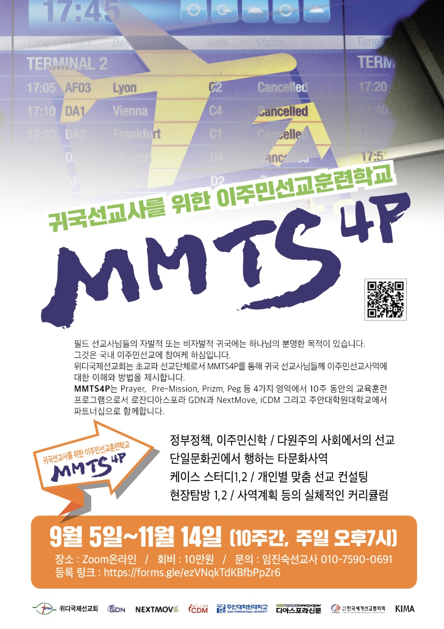 MMTS4P - 귀국선교사를 위한 이주민선교훈련학교는 선교사들의 이주민 선교 참여를 돕는 4가지 영역의 프로그램으로, 10주 동안의 교육훈련 프로그램으로서 로잔디아스포라 GDN과 NextMove, iCDM 그리고 주안대학원대학교에서 파트너십으로 함께합니다.