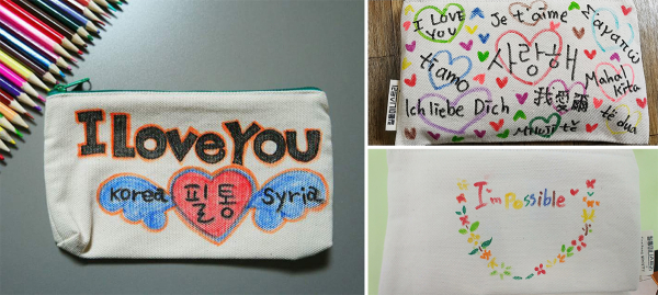 “한 번은 송도의 한 교회 청년이 시리아 이야기를 듣고 필통에 그림을 그려 보내주었는데, 감동을 받았어요. 한 면은 슬퍼서 눈물짓고 있는 사람들을 다른 슬퍼하는 사람들이 안아주는 그림이, 다른 면은 위로와 안식을 얻은 사람이 서로 얼싸안고 행복을 맛보는 그림인데, 양해를 구하고 필통사역 강의 때마다 샘플로 가지고 다니며 소개하고 있습니다.