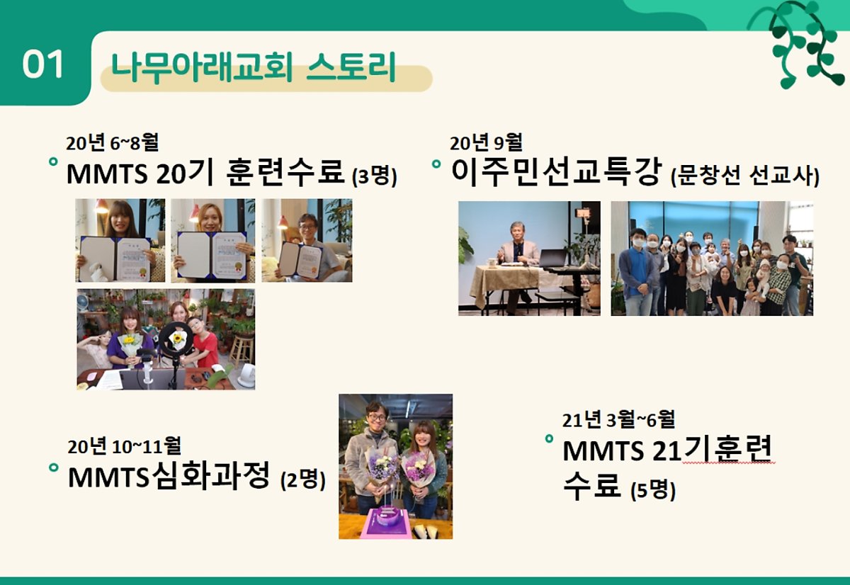 나무아래교회가 2019년 7월 6일 설립된 지 2년이 되었습니다. 코로나와 함께 지내온 2년간, 보라사역을 통해 복음을 전하여 세례를 베풀고 함께 가족이 되어 교제하며 하나님을 예배하였습니다. 이주 유학생들을 섬기며, 함께 선교훈련을 받으며, 이주민선교사역을 감당하는 선교사로 세워지는 은혜를 주셨습니다. 지금까지 이끌어주신 하나님의 은혜에 감사합니다. 마음을 모아 힘껏 후원해주시고 기도해주신 모든 동역자 분들에게 감사의 마음을 전합니다.