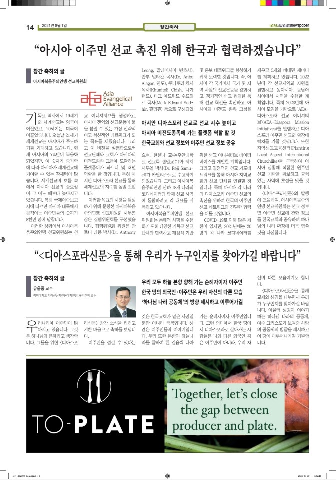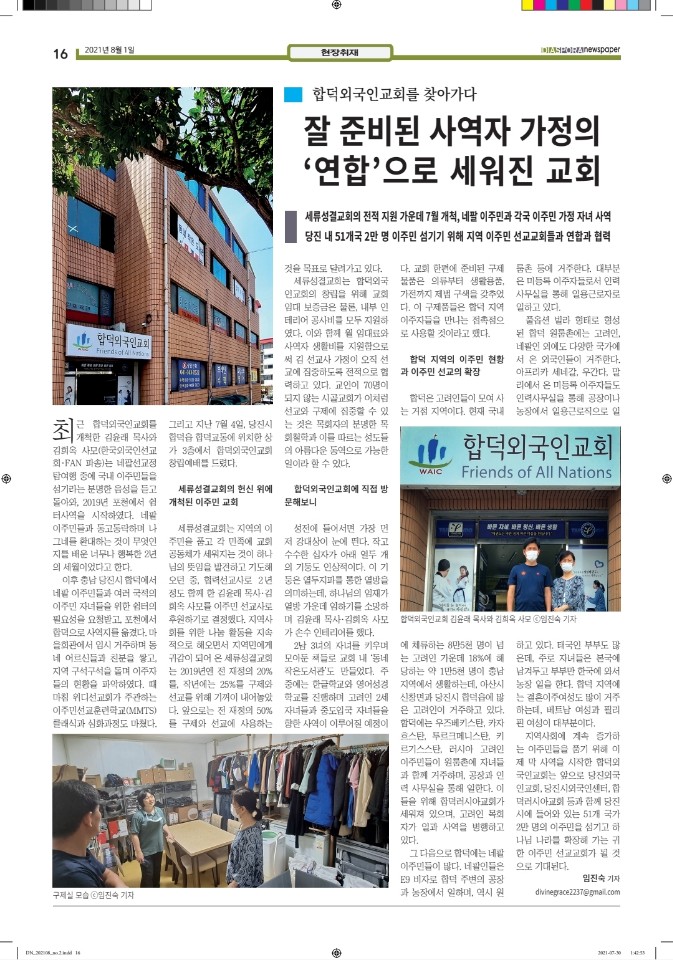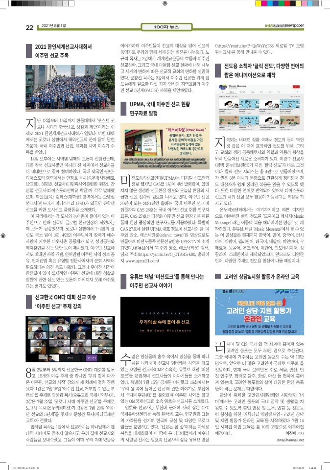 공지 [디아스포라신문] 제 2 호_2021년 8월 by 위디국제선교회1 2021. 8. 18. 공유하기 게시글 관리 WiThee Mission International 저작자표시 비영리 (새창열림) 관련글 [디아스포라신문] 제 4 호_2021년 10월_고국을 떠나야 했던 사람들, '난민' [디아스포라신문] 제 3 호_2021년 9월_이주민선교의 핵심 '환대' 로잔 글로벌 디아스포라 서밋 2021 [디아스포라신문] 창간호