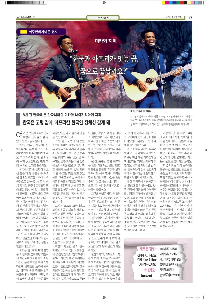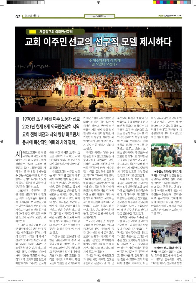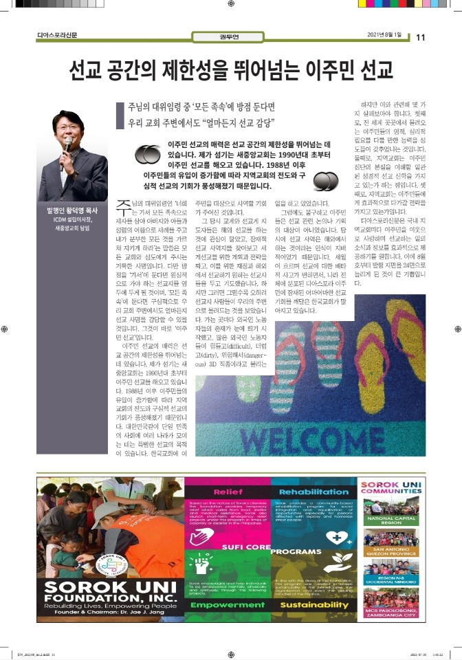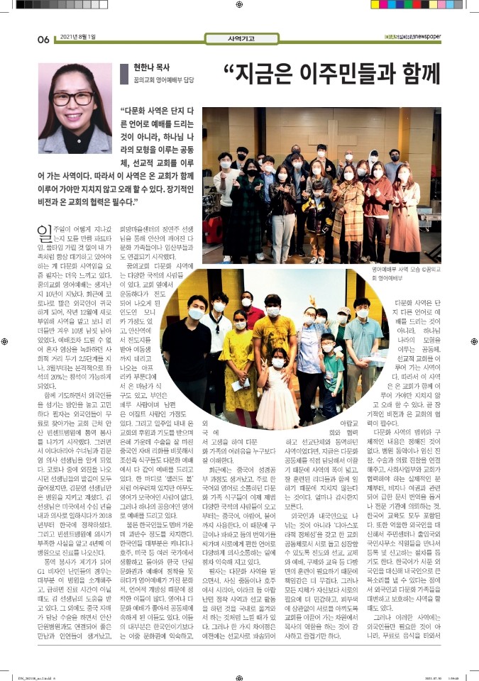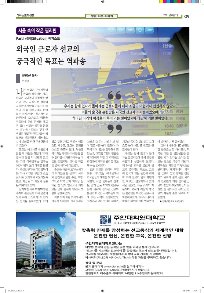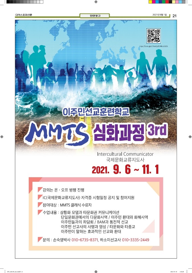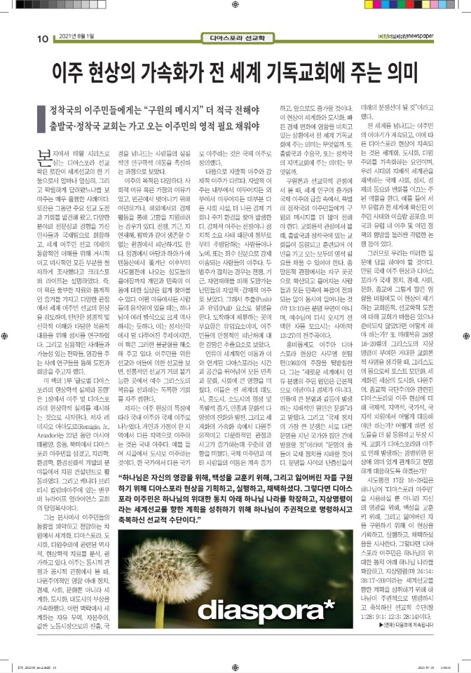 공지 [디아스포라신문] 제 2 호_2021년 8월 by 위디국제선교회1 2021. 8. 18. 공유하기 게시글 관리 WiThee Mission International 저작자표시 비영리 (새창열림) 관련글 [디아스포라신문] 제 4 호_2021년 10월_고국을 떠나야 했던 사람들, '난민' [디아스포라신문] 제 3 호_2021년 9월_이주민선교의 핵심 '환대' 로잔 글로벌 디아스포라 서밋 2021 [디아스포라신문] 창간호