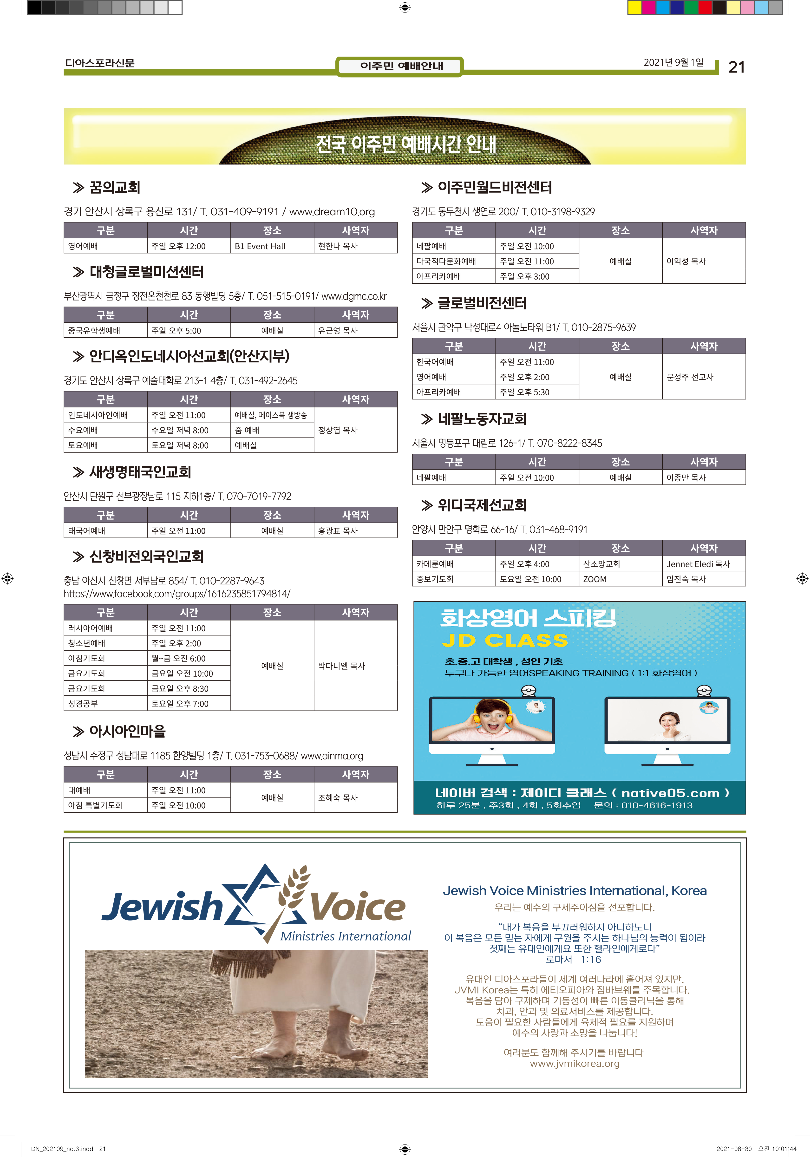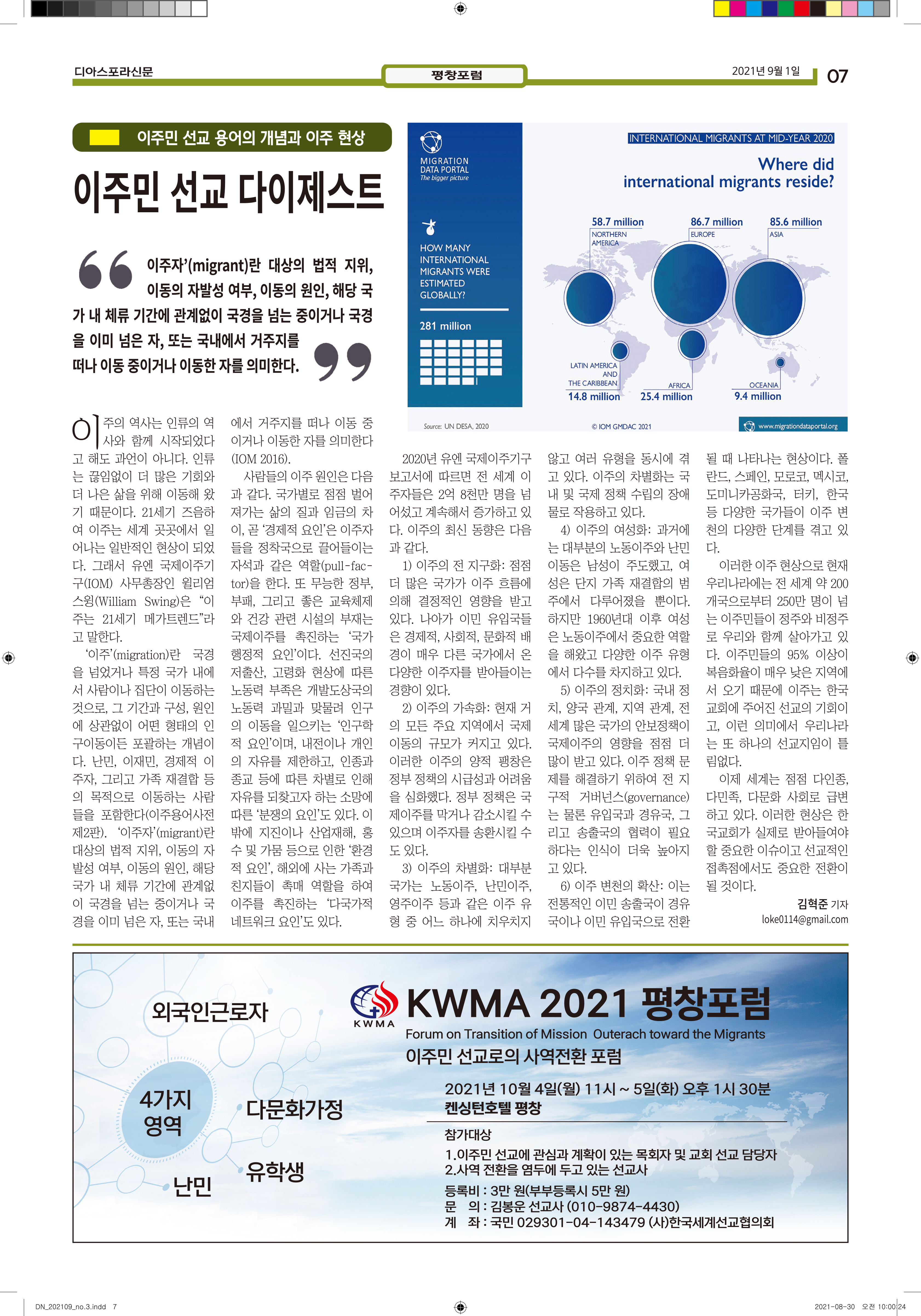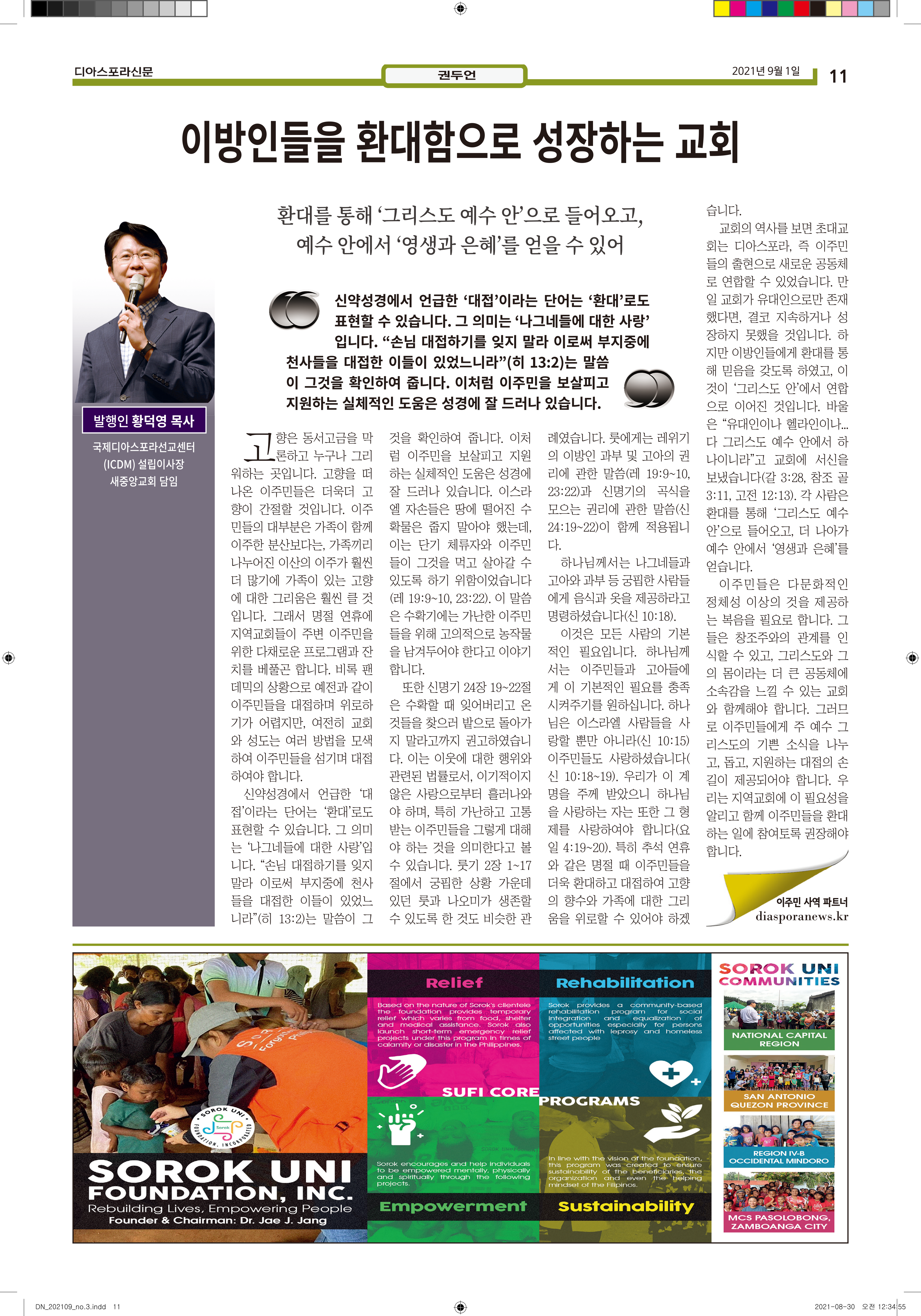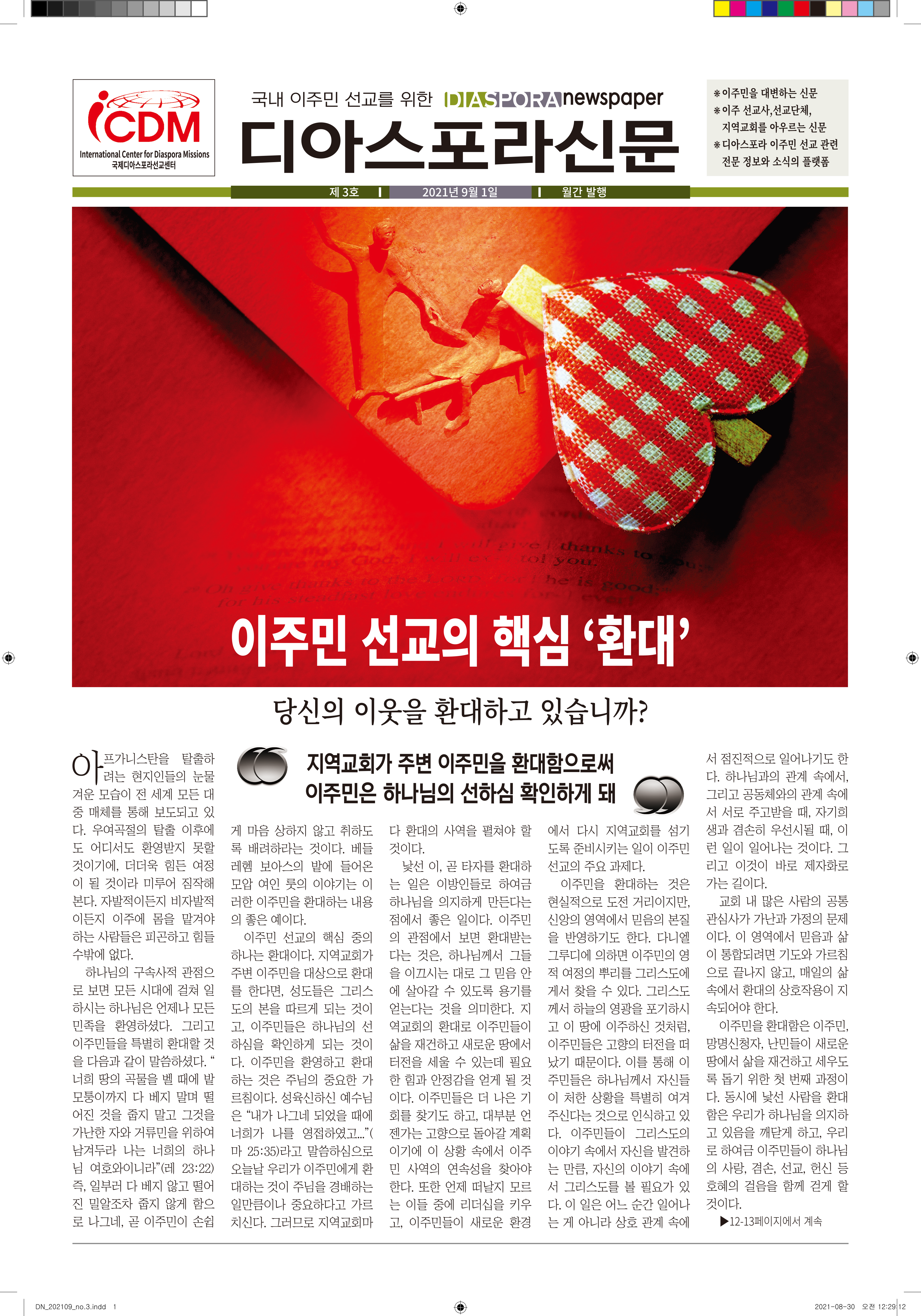 공지 [디아스포라신문] 제 3 호_2021년 9월_이주민선교의 핵심 '환대' by 위디국제선교회1 2021. 9. 2. 공유하기 게시글 관리 WiThee Mission International 저작자표시 비영리 (새창열림) 관련글 [디아스포라신문] 제 5 호_2021년 11월_우리의 이웃은 모두 안녕하십니까? [디아스포라신문] 제 4 호_2021년 10월_고국을 떠나야 했던 사람들, '난민' [디아스포라신문] 제 2 호_2021년 8월 로잔 글로벌 디아스포라 서밋 2021