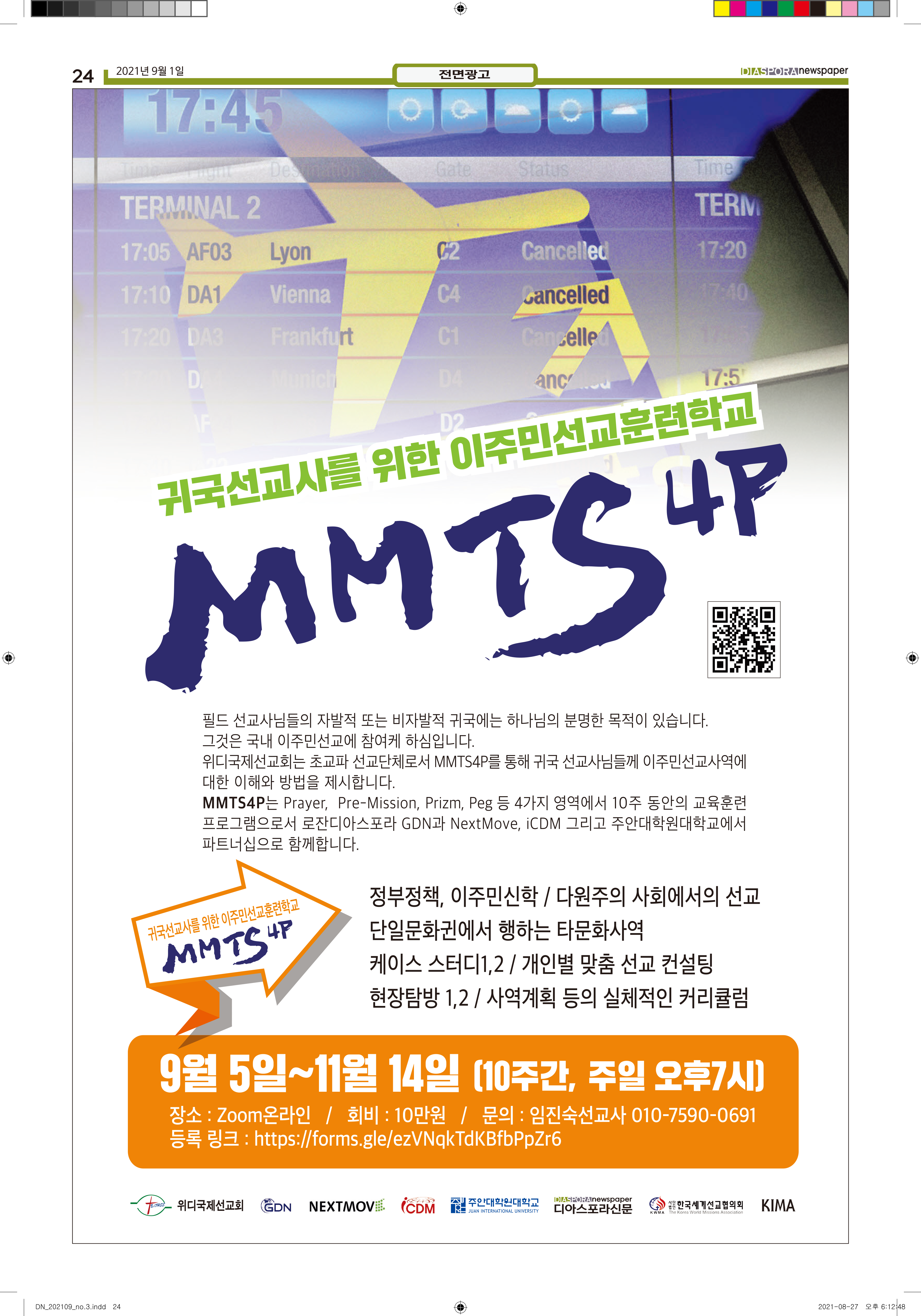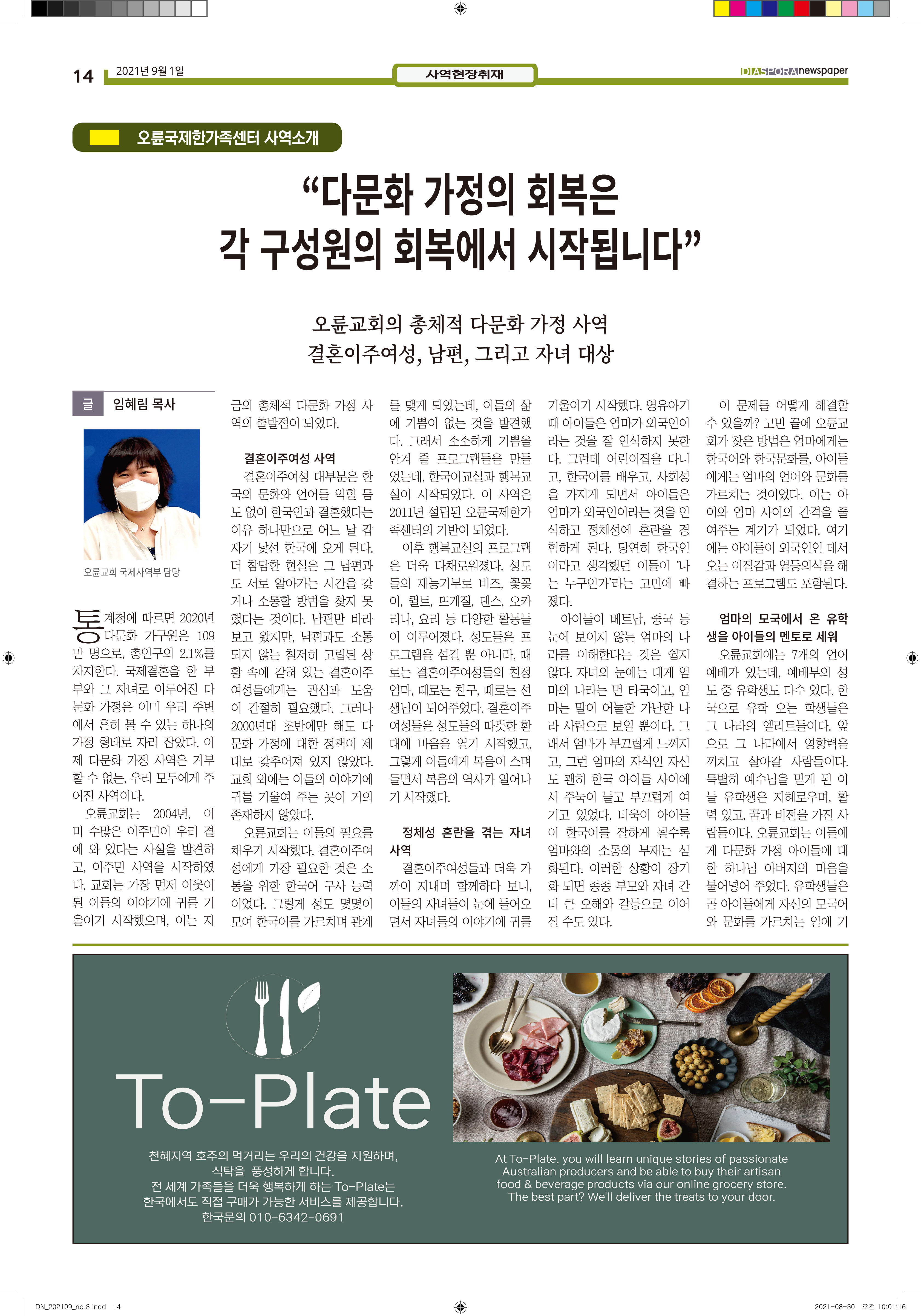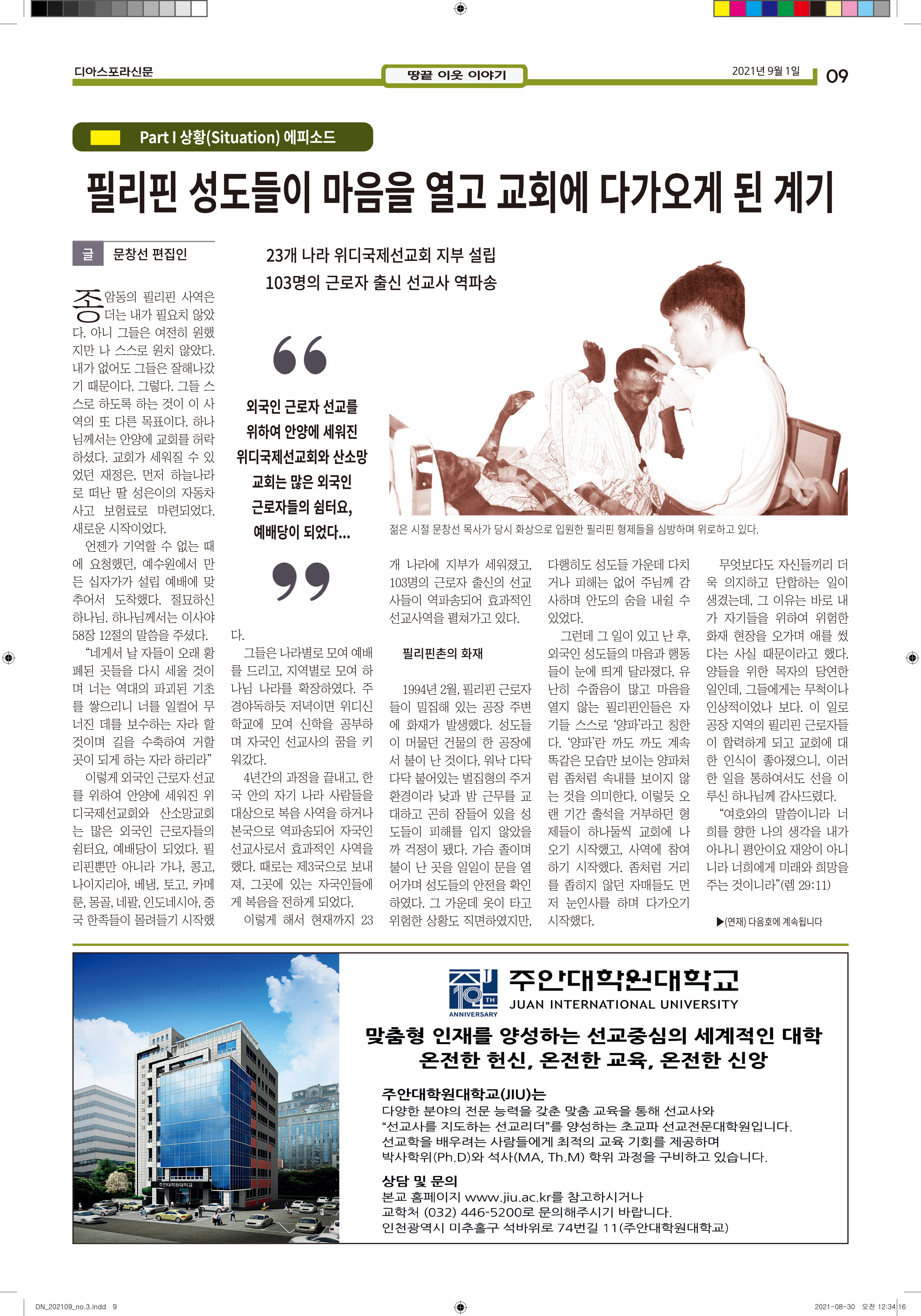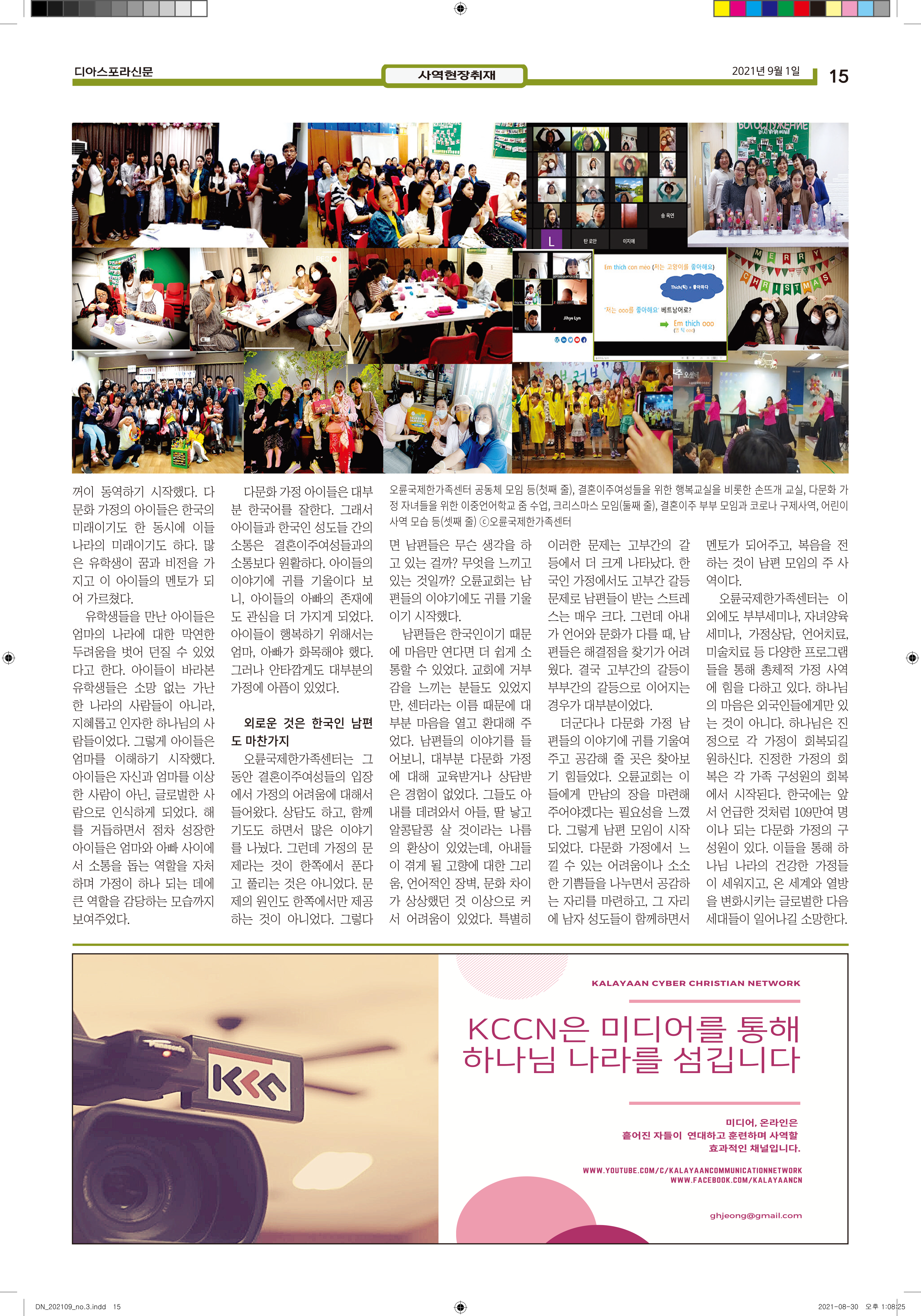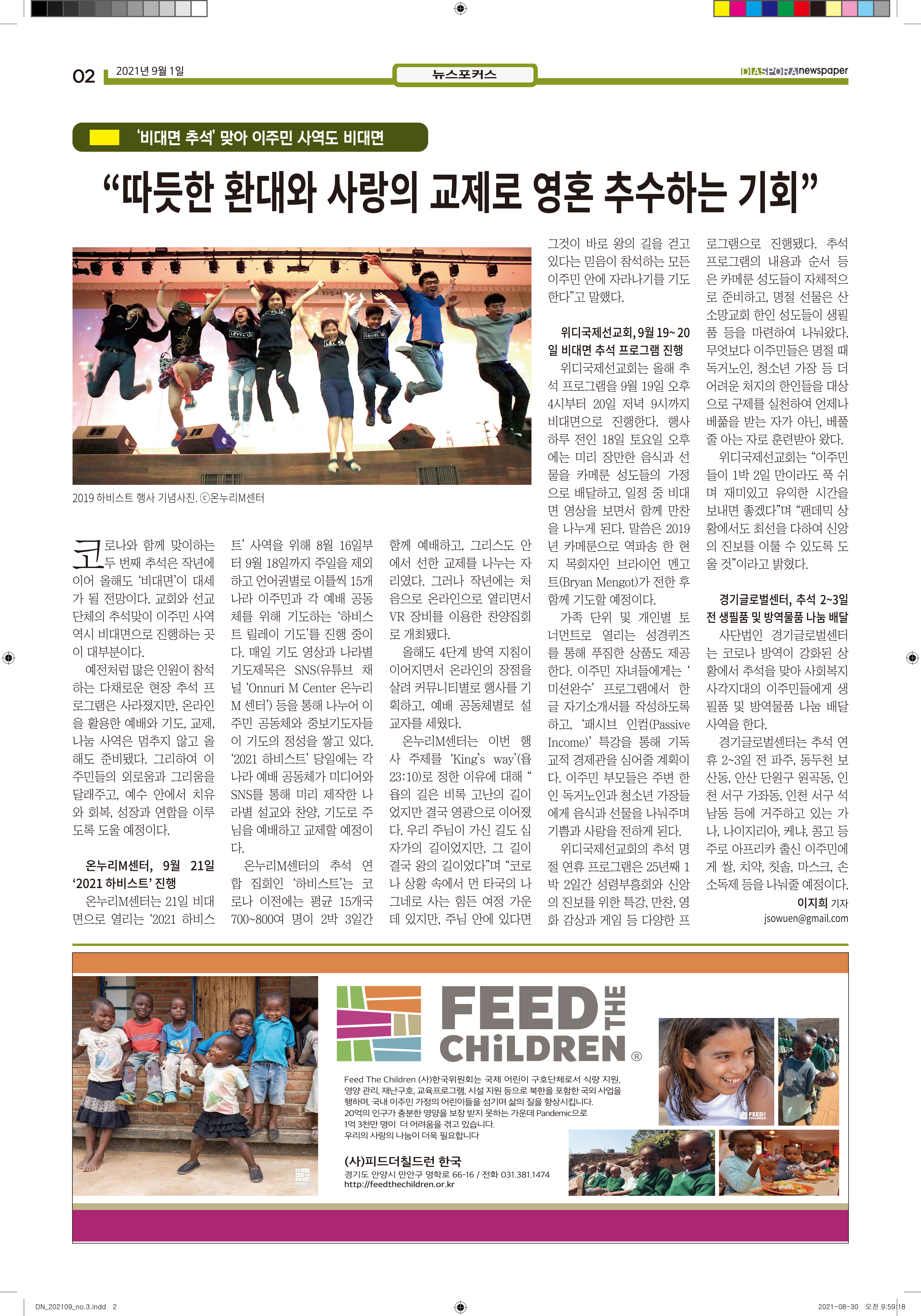 공지 [디아스포라신문] 제 3 호_2021년 9월_이주민선교의 핵심 '환대' by 위디국제선교회1 2021. 9. 2. 공유하기 게시글 관리 WiThee Mission International 저작자표시 비영리 (새창열림) 관련글 [디아스포라신문] 제 5 호_2021년 11월_우리의 이웃은 모두 안녕하십니까? [디아스포라신문] 제 4 호_2021년 10월_고국을 떠나야 했던 사람들, '난민' [디아스포라신문] 제 2 호_2021년 8월 로잔 글로벌 디아스포라 서밋 2021