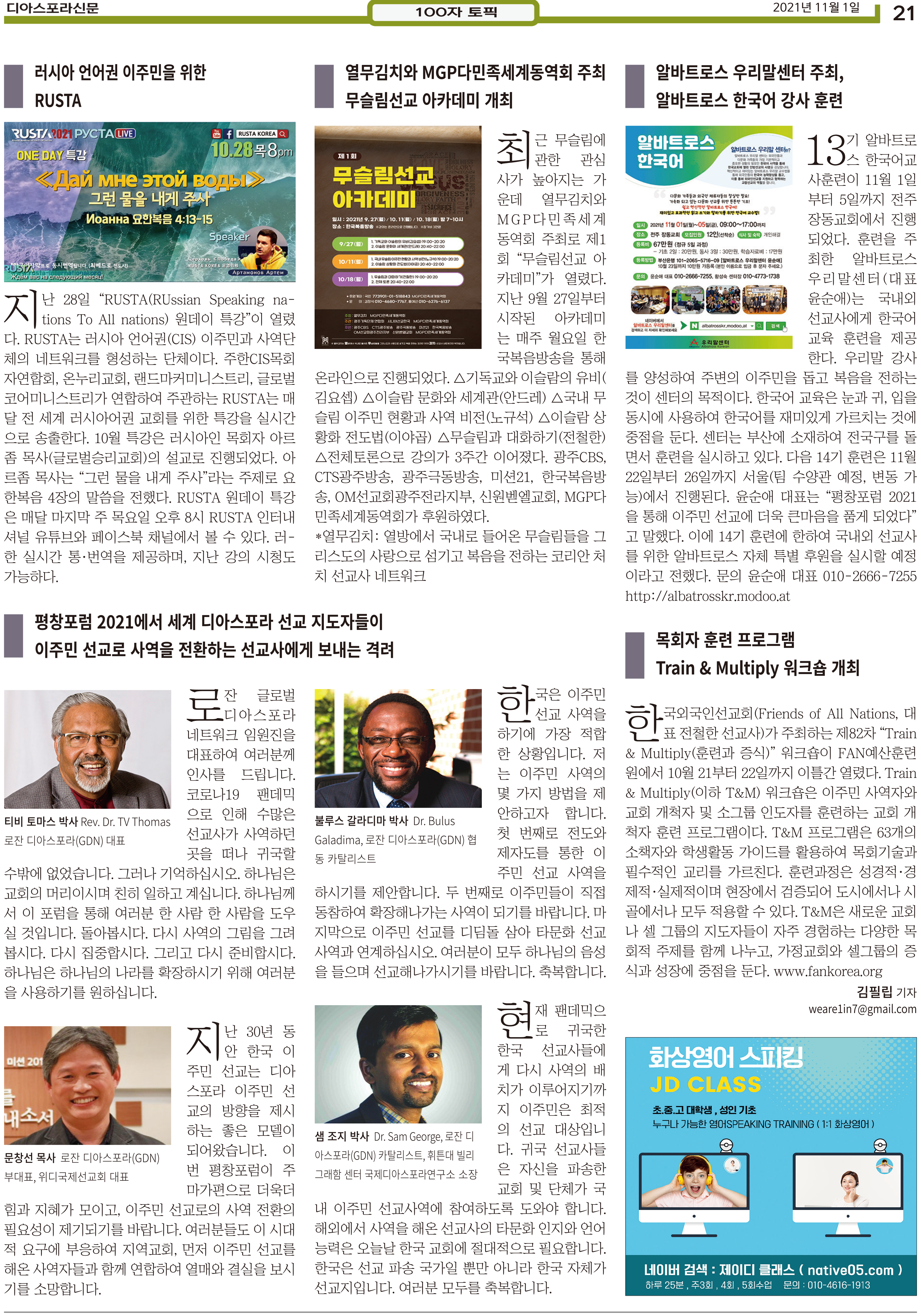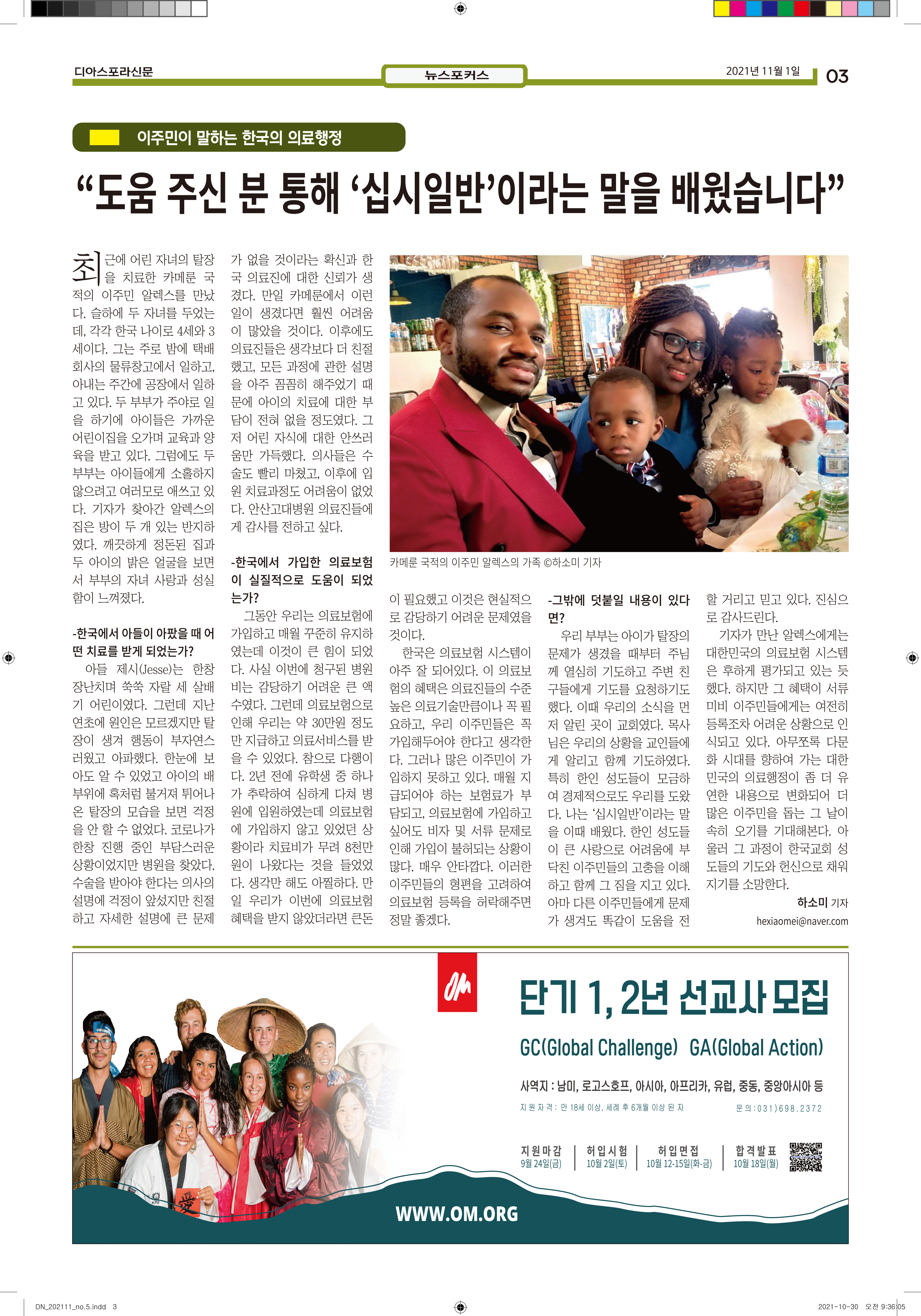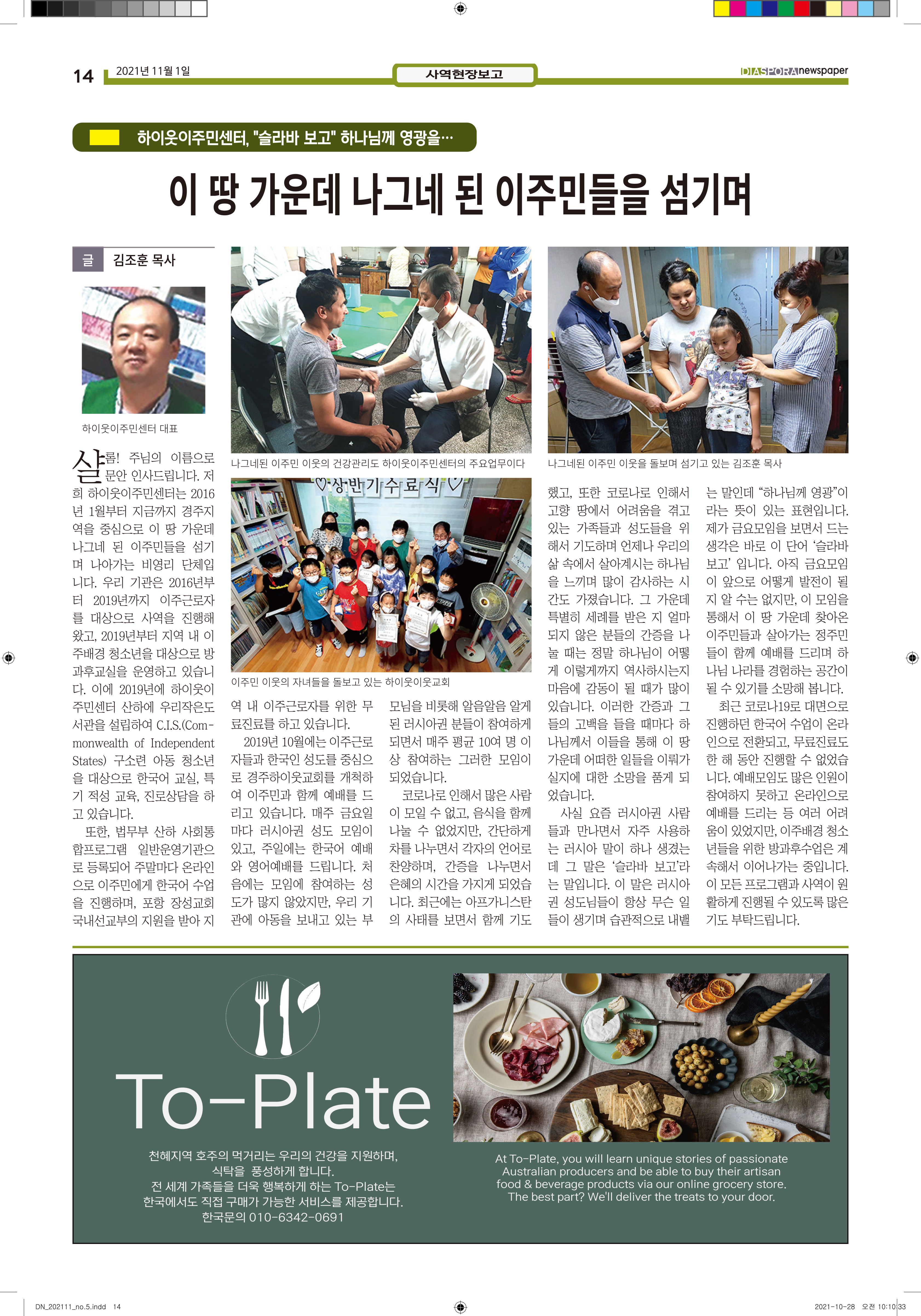 공지 [디아스포라신문] 제 5 호_2021년 11월_우리의 이웃은 모두 안녕하십니까? by 위디국제선교회1 2021. 11. 11. 제 5 호_2021년 11월_우리의 이웃은 모두 안녕하십니까? www.diasporanews.kr 공유하기 게시글 관리 WiThee Mission International 저작자표시 비영리 (새창열림) 관련글 missionNaga2022 MMTS 4P 2기 과정 [디아스포라신문] 제 4 호_2021년 10월_고국을 떠나야 했던 사람들, '난민' [디아스포라신문] 제 3 호_2021년 9월_이주민선교의 핵심 '환대'