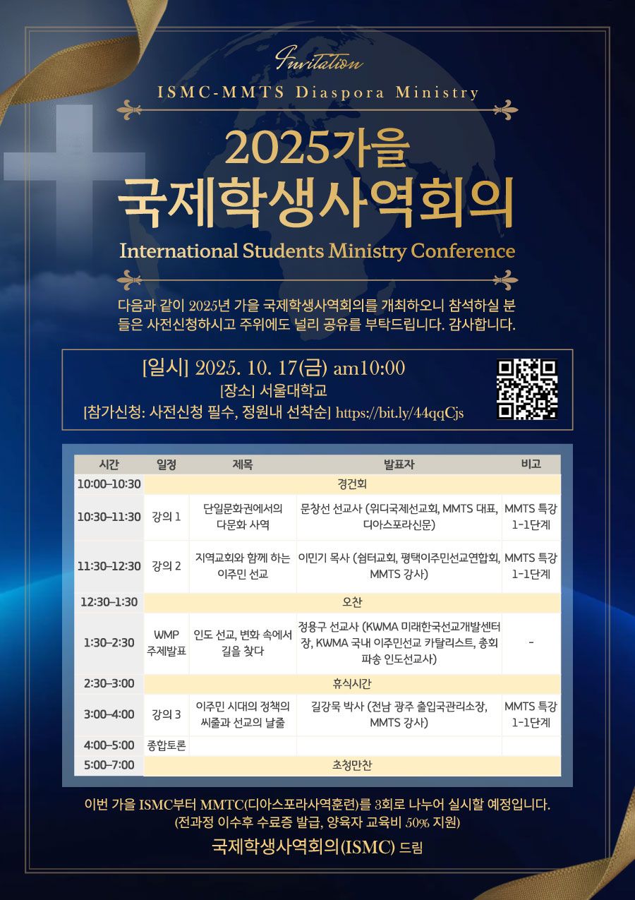 앞으로도 몇 가지를 함께 기도해 주시길 부탁드립니다. 첫째, MMTS와 여러 강의와 훈련과정을 통해 준비되는 이들이 실제 현장으로 나아가 디아스포라와 함께 교회를 세우는 건강한 리더로 세워질 수 있도록 기도해 주십시오. 둘째, WEA 서울 총회와 COALA 3.5, 서울 디아스포라 선교 심포지움을 통해 열린 만남과 네트워크가 일회성 행사가 아니라, 한국 교회와 세계선교 간의 실질적인 협력과 동반자 관계로 이어지도록 기도해 주십시오. 셋째, 무엇보다 모든 사역이 사람의 이름이 아니라 하나님께만 영광이 되도록 기억해 주시기 바랍니다.