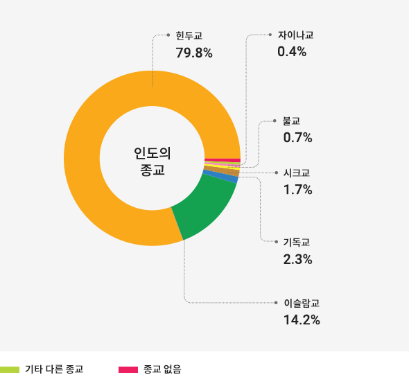 힌두교인구가 80%가까이 되며 이슬람이 14.2% 기독교인구는 2.3%정도로 알려져 있습니다.