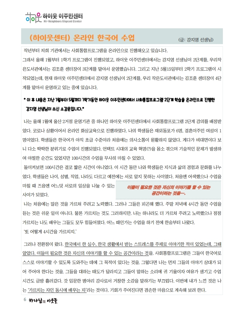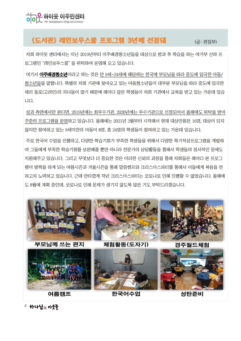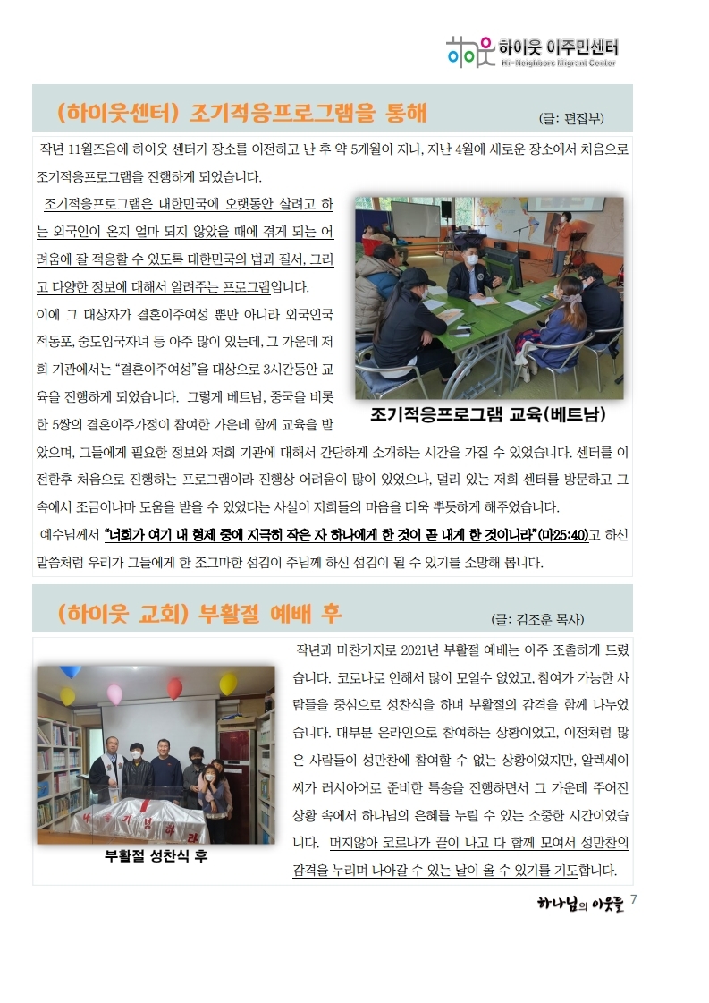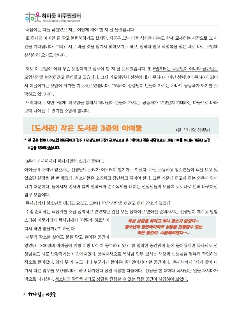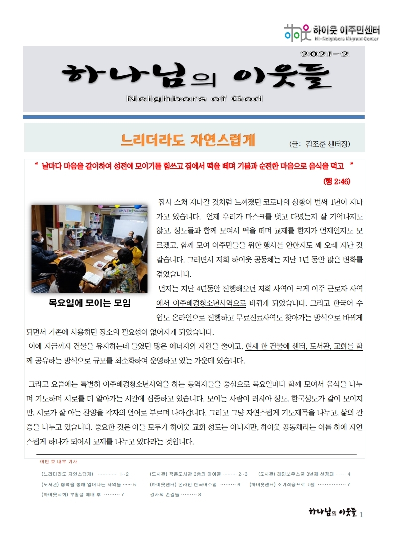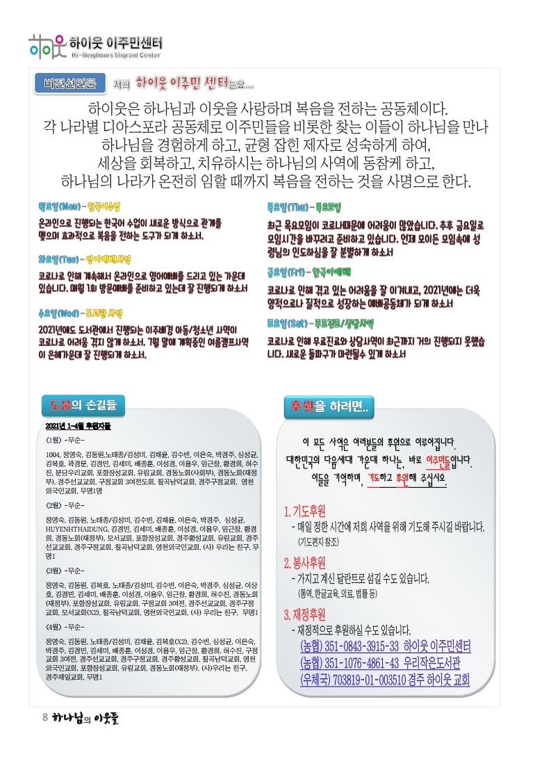 위디소식/중보기도요청 [하이웃]하나님의 이웃들 2021-2소식 by 위디국제선교회1 2021. 6. 8. 안녕하세요? 하이웃센터 김조훈 목사입니다. 2021년도 거의 반이 다 되었네요. 짧지만 지난 5개월동안 사역을 돌아보면서 하나님께 감사를 드리게 됩니다. 함께 해주셔서 감사합니다. 공유하기 게시글 관리 WiThee Mission International 저작자표시 비영리 (새창열림) 관련글 [필통미니스토리]땅끝12.17th미션.니카라과 [필통미니스토리]땅끝12.16th미션.인도 [필통미니스토리]땅끝12.15th미션.미얀마 [필통미니스토리]땅끝12.14th미션.조지아