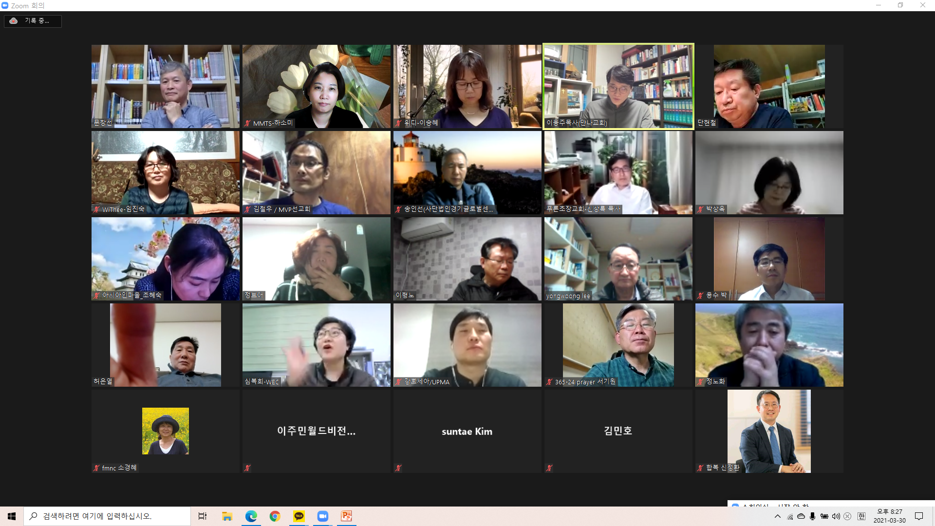 2. 지난 2월 아시아복음주의 연맹(AEA)의 선교대표로 추대된 문창선 선교사는 3월 한 달간 아시아선교를 위한 각 나라의 대표들을 세우는 일에 집중하였고 지난 30일 첫 모임을 가쪘으며, 31일 수요일에는 각 나라에서 참여한 270여명의 영혼들이 온라인을 통하여 미얀마를 위해 간절히 호소하는 기도회를 가졌습니다.