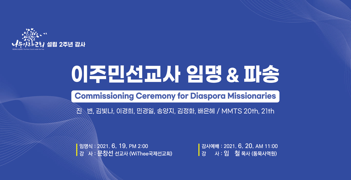 2. 3월 46명 등록으로 시작한 MMTS 21기는 6월 14일에 최종 서른 일곱 분이 훈련을 통과하여 수료를 마쳤습니다. 더욱 기쁜 일은 클래식 20기와 심화 2기를 마치신 대전 나무아래 교회 담임이신 이상화 목사님은 교회설립 2주년을 맞아 20,21기를 마치신 7명의 수료자들에게 위디를 초청하여 이주민선교사 임명식을 가졌으며, 그 가운데 중국 J자매님을 선교사로 파송하는 파송식도 가져 매우 뜻 깊은 MMTS이후의 결과물이 되었습니다.