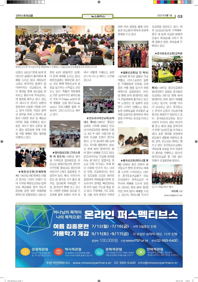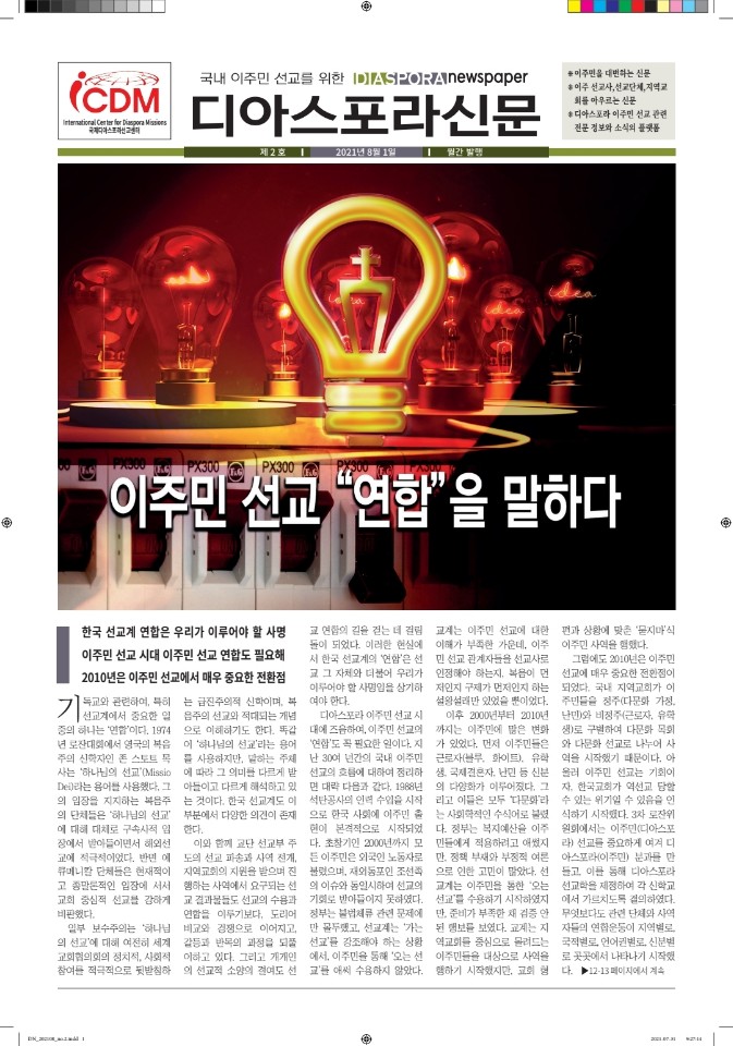 1. 디아스포라 신문 등록과정을 잘 마쳤습니다. 현재 디아스포라 신문팀은 13명의 스텝들로 수고하고 있으며 올해 10월까지 ICDM의 이사장이신 새중앙교회에서 발간에 따른 모든 재정을 지원해 주고 계십니다.