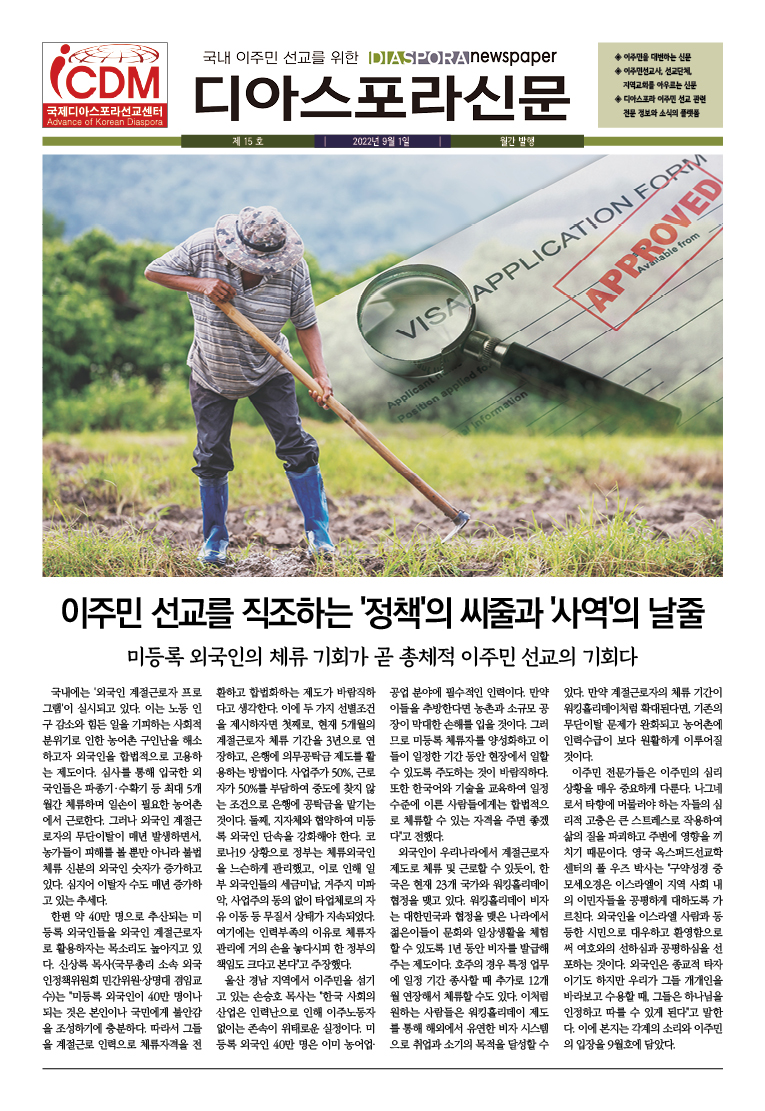 1. 디아스포라 신문 9월호는 계절근로자건을 조명하여 전문 사역자들의 의견과 조정훈 국회의원등 관련된 전방위적 의견을 모아 발행하였습니다. 850부를 발송하였고 온라인으로도 공유하고 있습니다.(www.diasporanews.kr)
