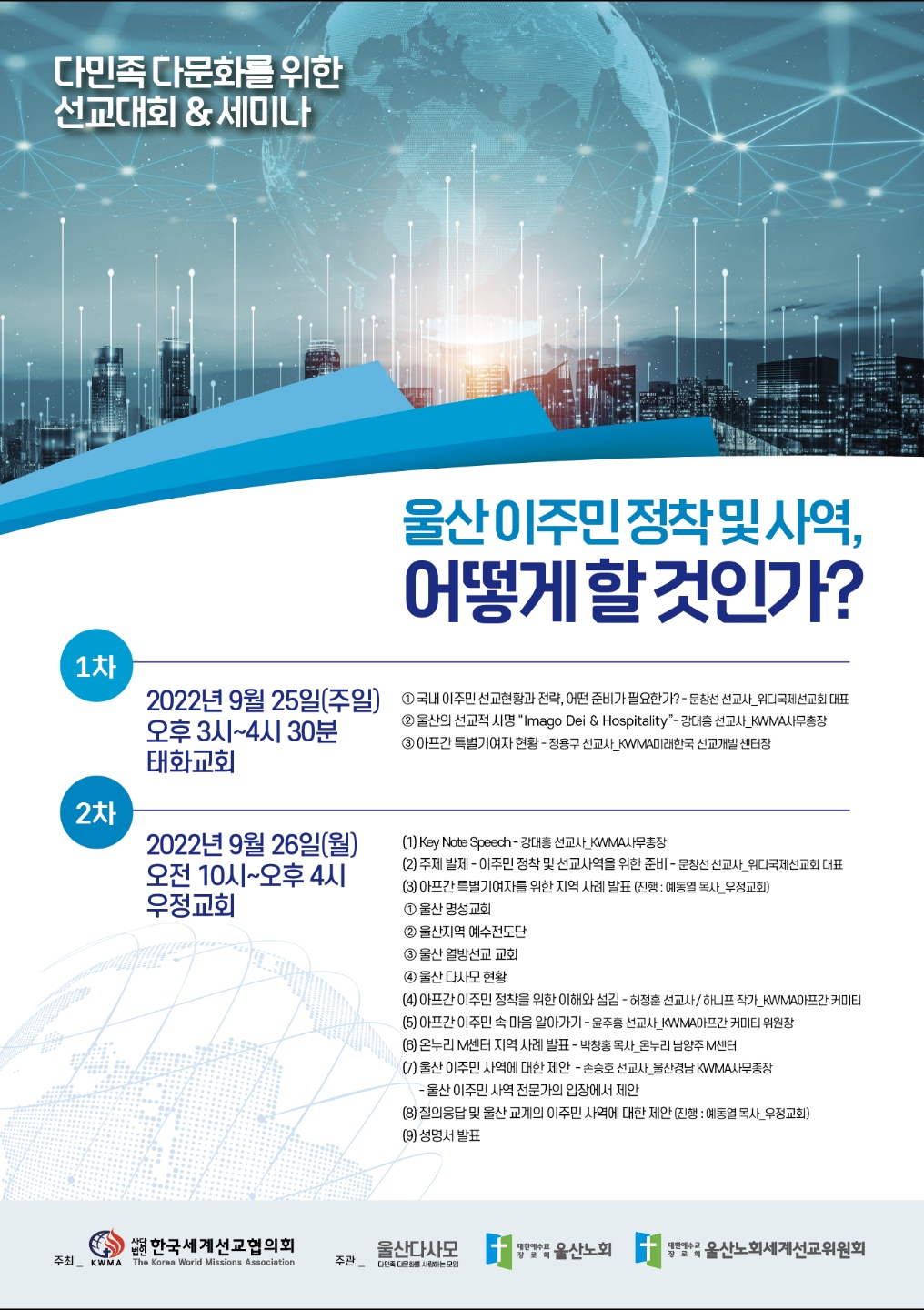 3. 울산에는 17,000여 명의 이주민들이 머물고 있습니다. 1년 전 특별기여자로 들어온 아프가니스탄 스물 아홉 가정도 이에 포함됩니다. 울산지역 교회의 효과적인 섬김을 위하여 KWMA는 이주민 컨퍼런스가 1박 2일 동안 태화교회와 우정교회에서 각각 열렸습니다. 위디에서도 참여하여 이주민선교의 전략과 방법을 제공하고, 이주민선교의 확장에 일익을 감당하였습니다.