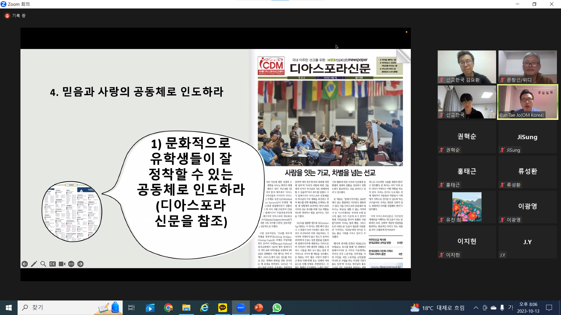 대외강의 사역은 매우 중요한데요, 지난 제주 컨설테이션에 참석하였던 브라질 디아스포라로서 독일에 머무는 파비아나 선교사님이 독일내에서 이주민 사역을 진행함에 있어서 실질적인 사역을 요청해왔습니다. 이에 정기적으로 개인과외(^^)를 줌으로 진행하기로 했습니다. 10월 17일 합동선교훈련본부 GMS를 방문하여 선교지로 파송되는 선교사님들에게 국내 이주민 선교의 전략과 협업이라는 주제로 도전하였습니다. 12일에는 왕성교회의 LMTS 선교훈련 프로그램에 초대되어 이주민선교의 이해와 참여에 대해 강의를 하였습니다. 10월 28일에는 사랑의교회 중직자들의 선교교육에 참여하여 이주민 선교를 도전하였습니다. 토요일 아침 일찍모여 교육에 참여하는 열정에 오히려 큰 감동을 받았습니다. 한편 29일에는 신촌에 소재한 그소망교회(이택환 목사)의 종교개혁 기념 포럼에 초대되어 디아스포라 선교에 대한 발제를 하였는데 교회 성전을 문화센터 공간을 주일마다 빌려서 사용하는 특이한 모습이었는데 오히려 큰 은혜가 있었습니다. 성도들은 주변 홍대거리에서 쉽게 볼 수 있는 유학생 이주민 선교에 어떻게 참여할 것인지에 대한 실질적 고민과 참여를 하겠다고 하였습니다. 이주민 선교에 관한 소리가 되어 필요한 곳에 전달하는 사역에 계속하여 응원과 기도를 부탁드립니다.