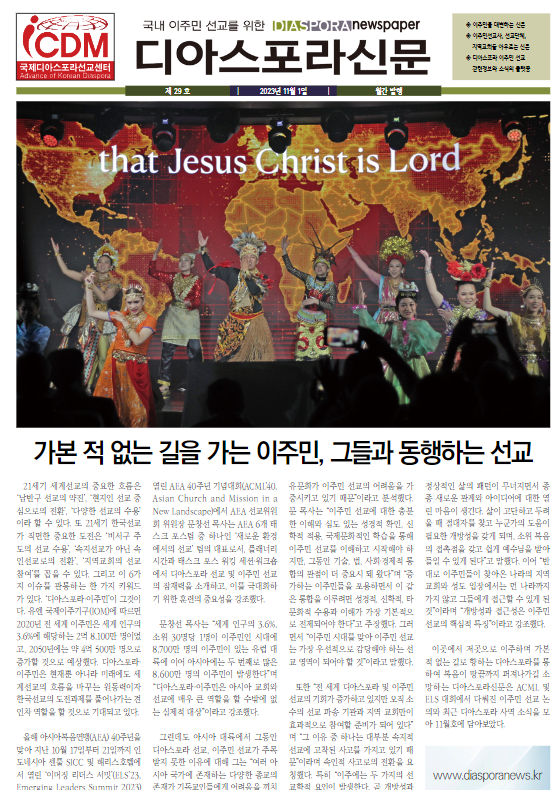 국제 연합 사역으로는 10월 18일 – 27일 기간에는 아시아복음주의연맹이 주관하는 차세대 리더들의 모임과 아시아 교회와 선교 컨설테이션에 참여하여 아시아 디아스포라와 이주민선교훈련학교 관련하여 4차례에 걸쳐 발제를 하였습니다. 다소 긴 일정이었는데 후원자들의 기도와 격려에 힘입어 사역을 마칠 수 있었습니다. 감사합니다. 위 내용은 디아스포라신문 11월호에 자세히 기록되어있습니다.