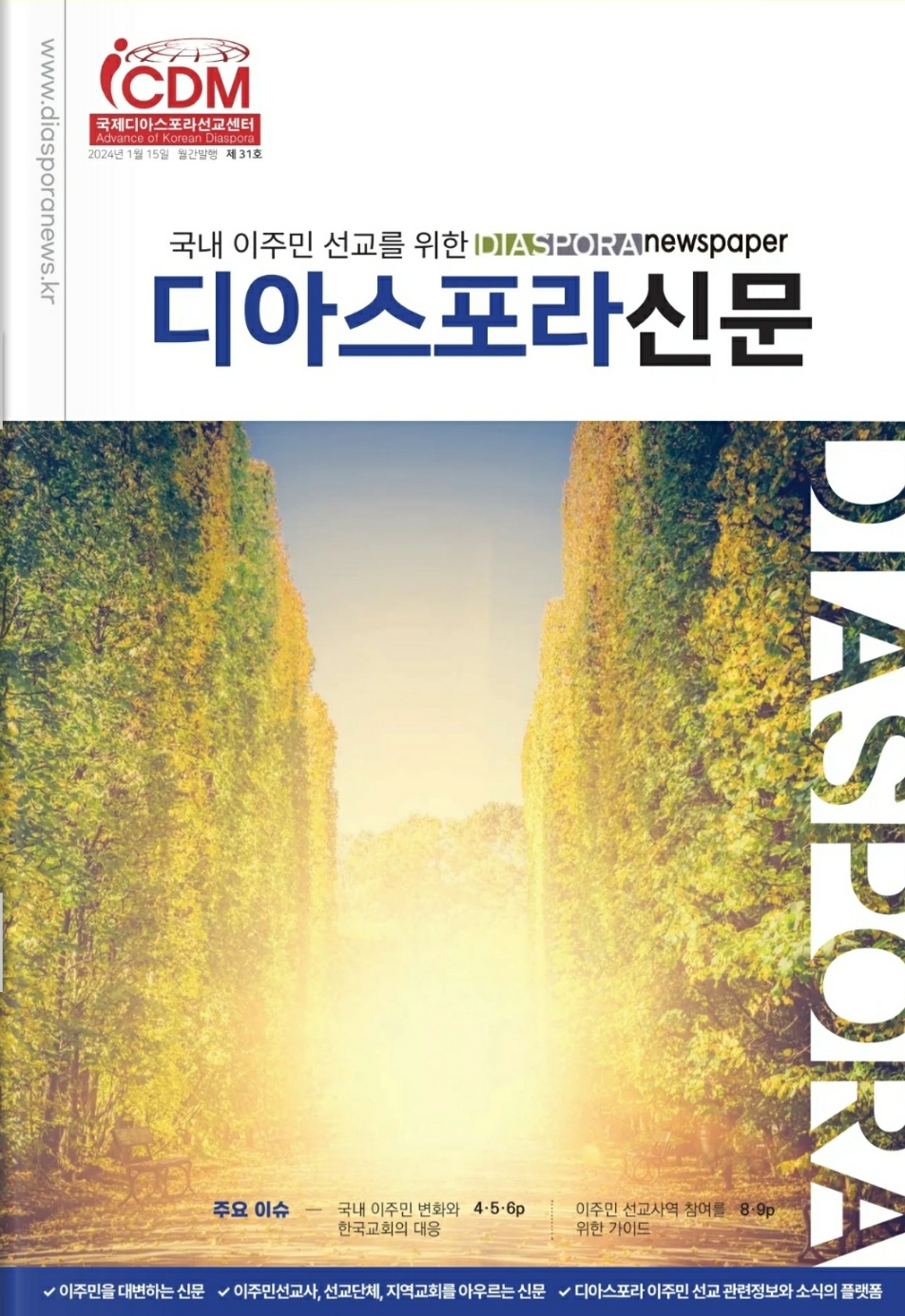 새해가 열리고 위디선교회에 가장 눈에 뛰는 변화는 디아스포라 신문 판형입니다. 1월호(31호)에 대한 독자들의 평가는 매우 긍정적이었습니다. 그리고 위디는 가시적인 것뿐만 아니라 담겨지는 기사 내용의 평가에 더 집중하기를 원합니다. 그동안 관심과 후원에 깊은 감사를 드리며 새해에도 더욱 이주민 선교 관련 양질의 사역을 위하여 기도와 최선을 다하고자 합니다.