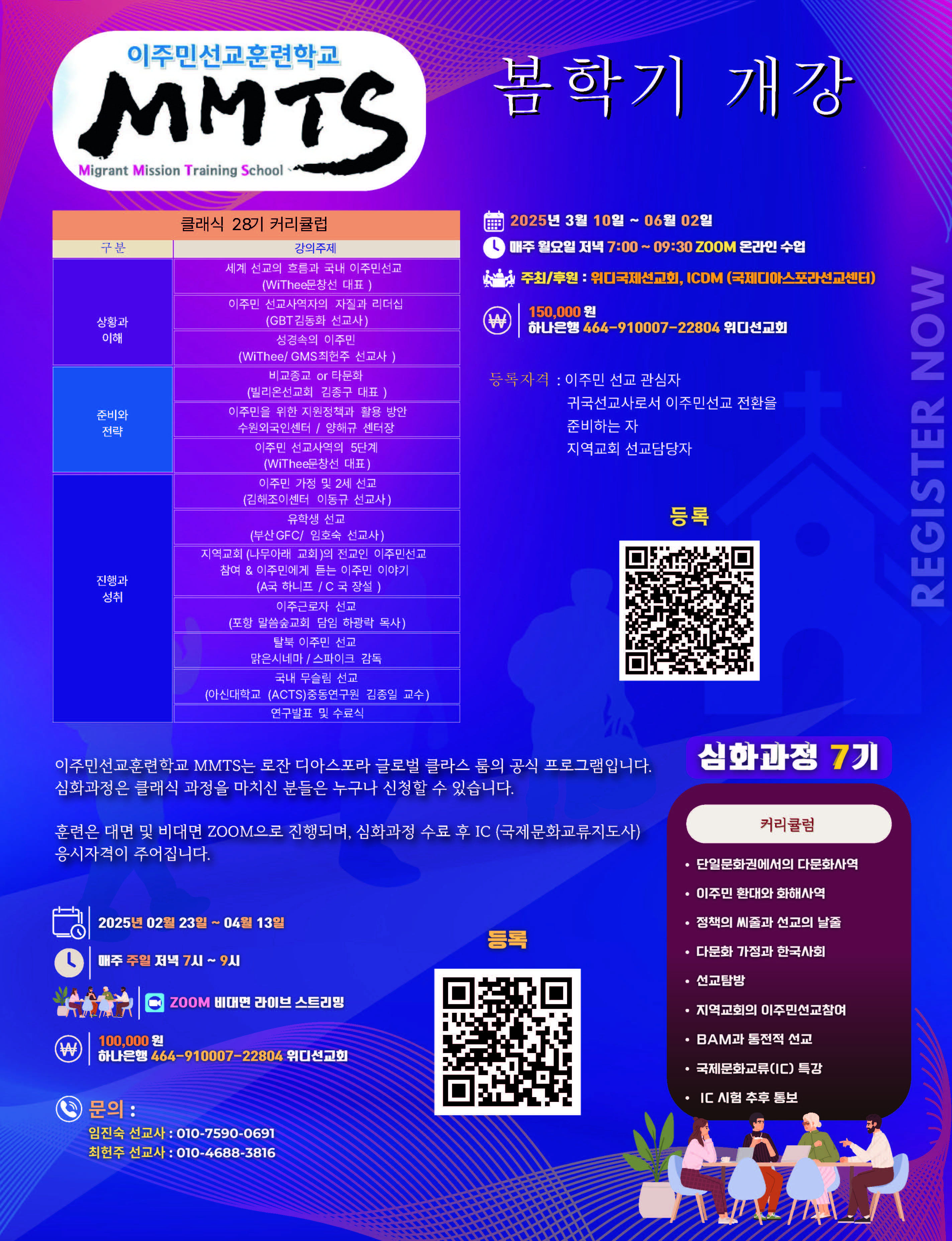 이주민선교훈련학교 MMTS는 Lausanne Diaspora Global Classroom의 공식 프로그램입니다. 일정 : 2025년 3월 10일 ~ 6월 2일 13주간. 매 주 월요일 저녁 7시 장소 : ZOOM 온라인 수업 및 일일 대면 견학 훈련비 : 15