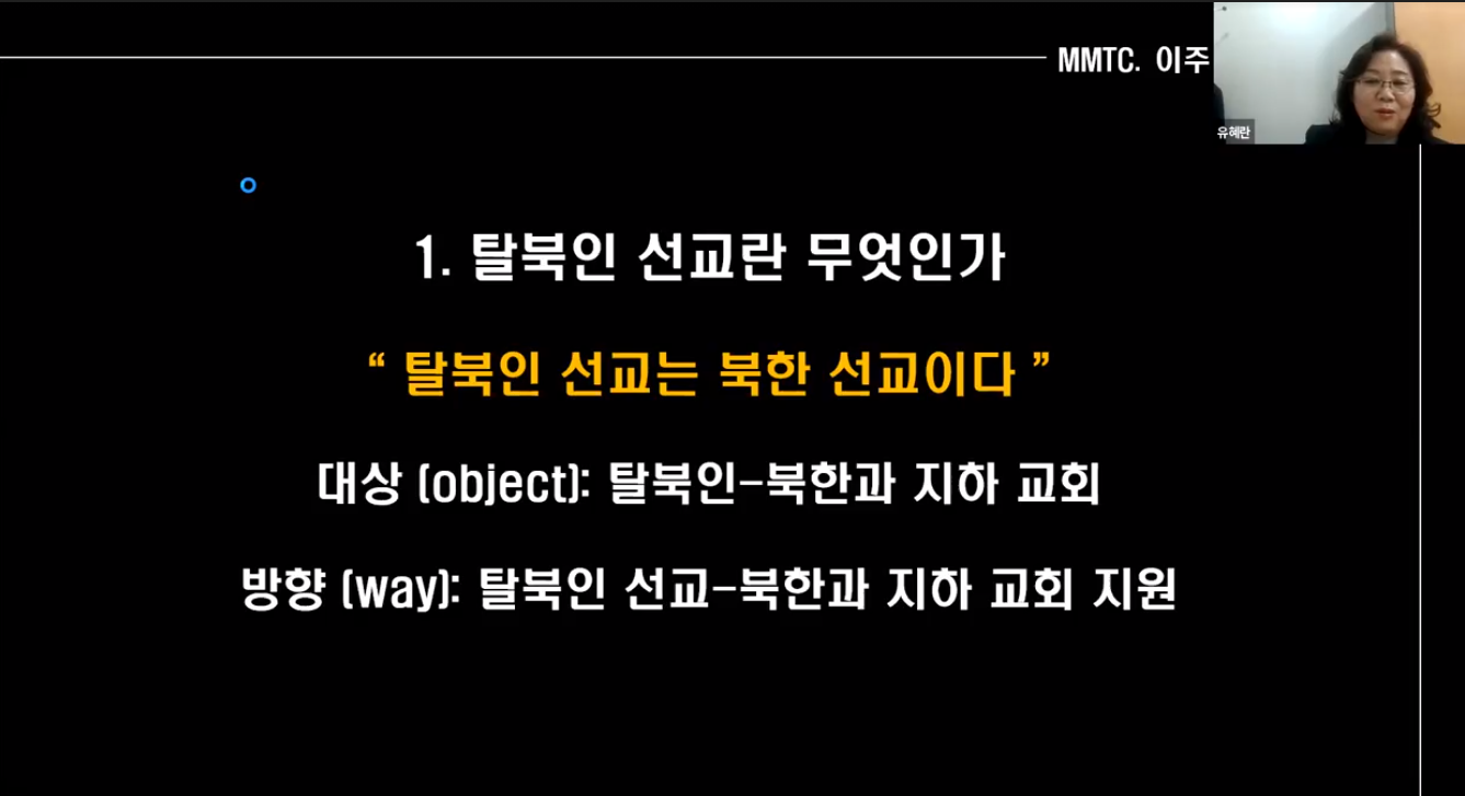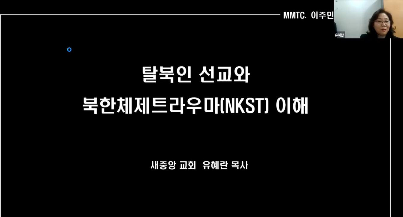 8강의 주제는 "탈북인 선교와 북한체제트라우마(NKST) 이해"(유혜란 목사)이었습니다.