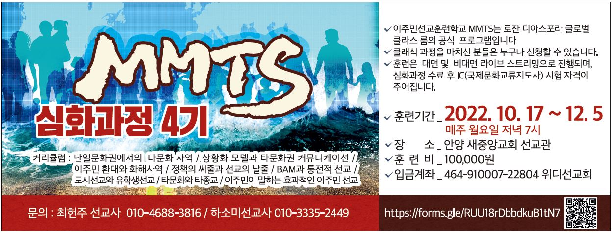 선교훈련/이주민선교 훈련 신청 MMTS 심화과정 4기 모집 by 위디국제선교회1 2022. 10. 10. MMTS 심화과정 4기 모집합니다. 문의 : 최헌주 선교사 010-4688-3816 하소미 선교사 010-3335-2449 신청링크: https://forms.gle/AT973gF4JxLYGtRT7 공유하기 게시글 관리 WiThee Mission International 저작자표시 비영리 (새창열림) 관련글 MMTS 심화과정 5기 이주민선교훈련학교 MMTS 24기 모집 이주민선교훈련학교 MMTS 23기 모집 MMTS 심화과정 3기 모집