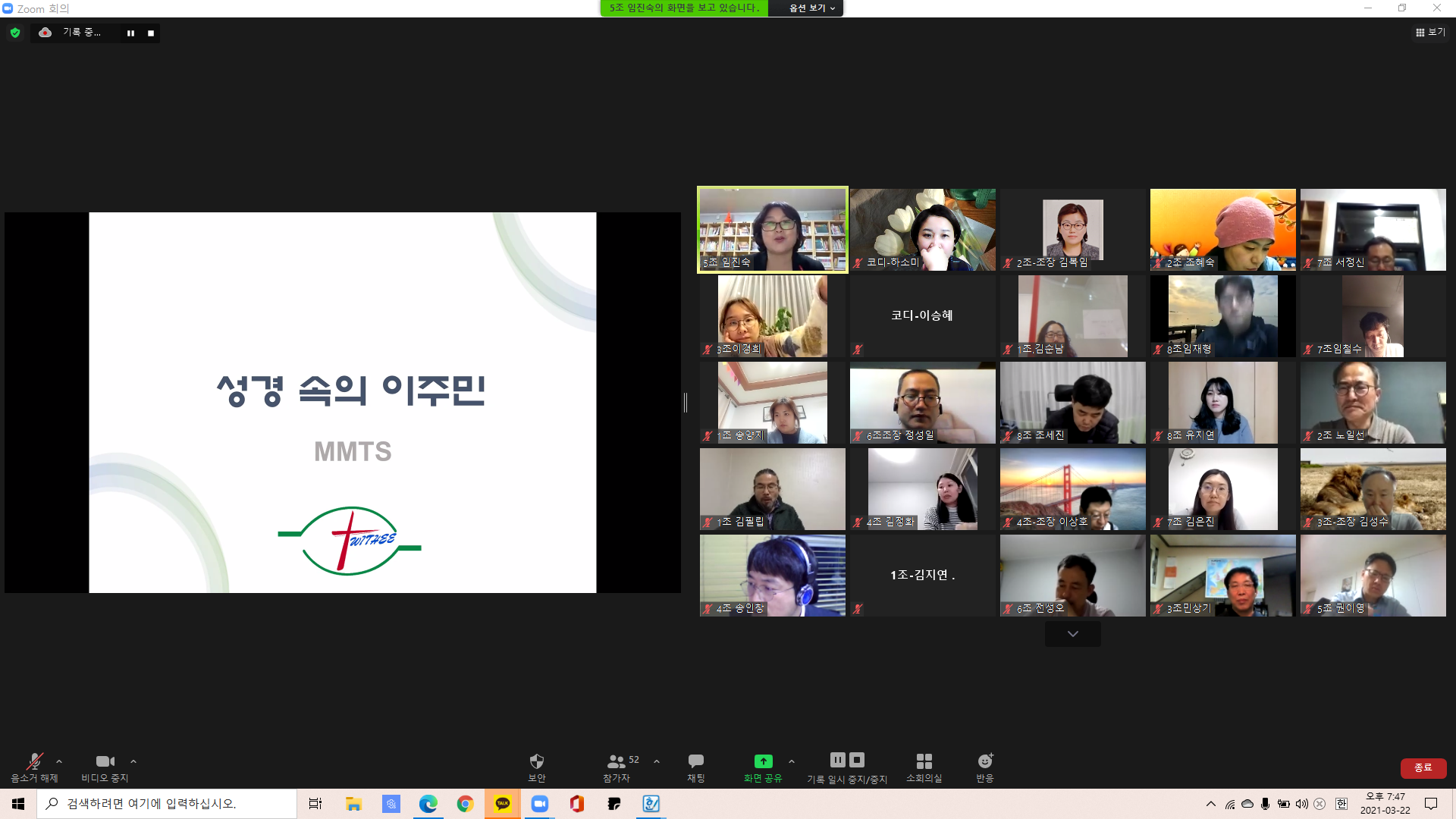 2021년 3월 22일(월) MMTS 21기 세번째 시간이 있었습니다. 위디국제선교회 부대표이신 임진숙 선교사님의 "성경 속의 이주민"에 관한 강의가 있었습니다. 훈련이 계속될 수록 우리의 시야가 넓어지고 이주민을 대하는 우리의 생각과 태도가 조금씩 변하고 있음을 실감합니다. MMTS의 모든 훈련을 기대합니다.