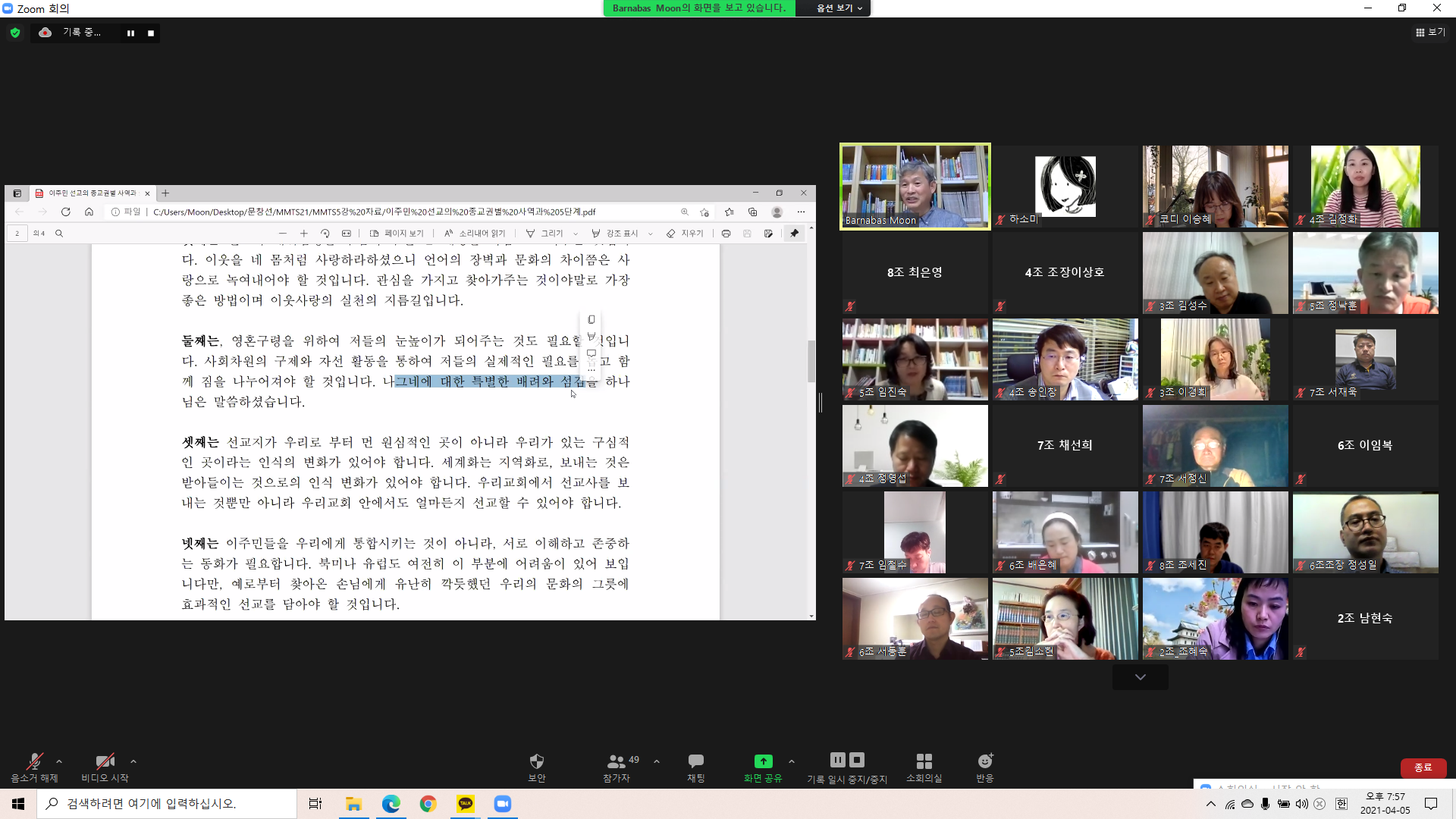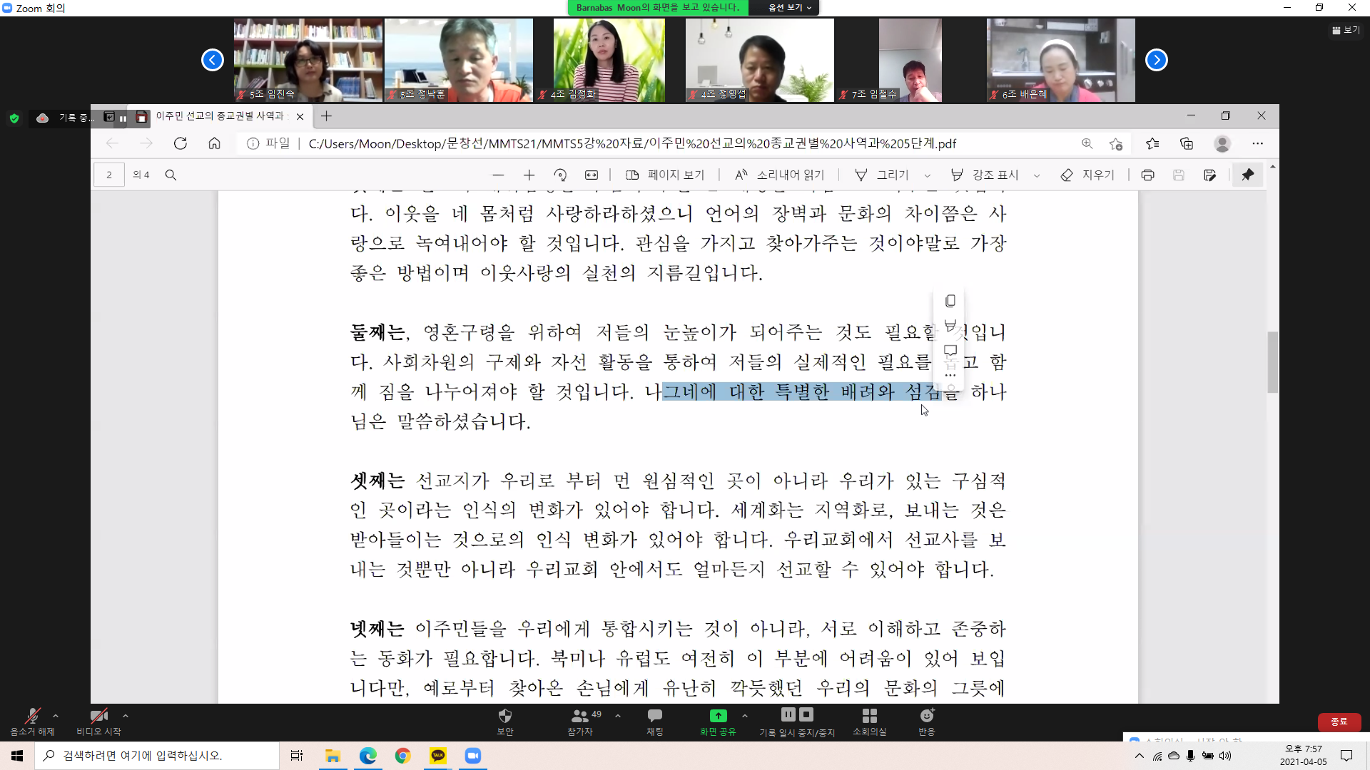 2021년 4월 5일(월) 부활의 기쁨을 가득 안고 MMTS 21기 다섯번째 시간으로 문창선 선교사님의 "이주민 선교의 종교권별 사역과 5단계"에 관한 강의가 있었습니다.