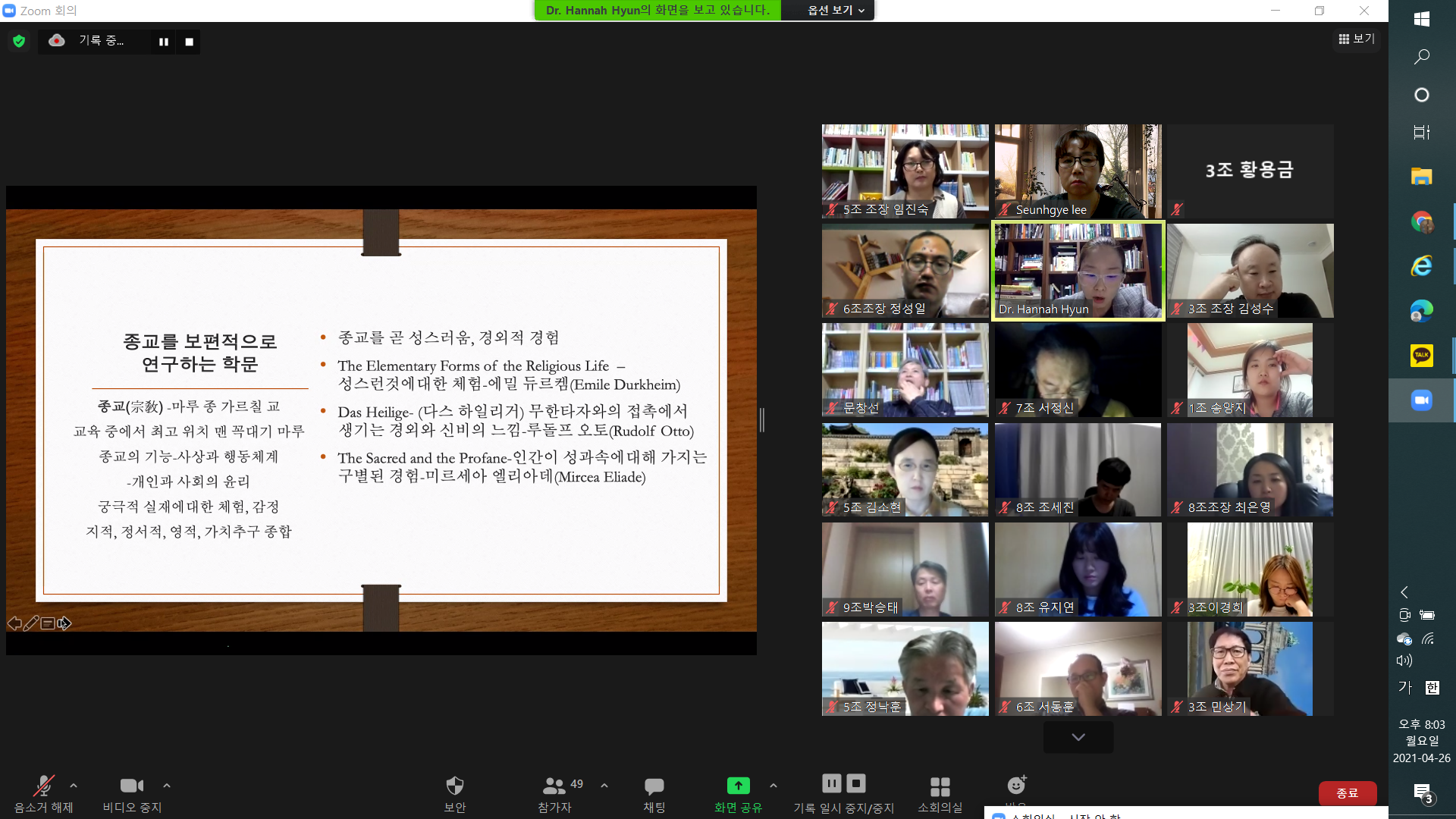 2021년 4월 26일(월) MMTS 21기 여덟번째 시간으로 현한나 교수님 "비교 종교"에 관한 강의가 있었습니다.