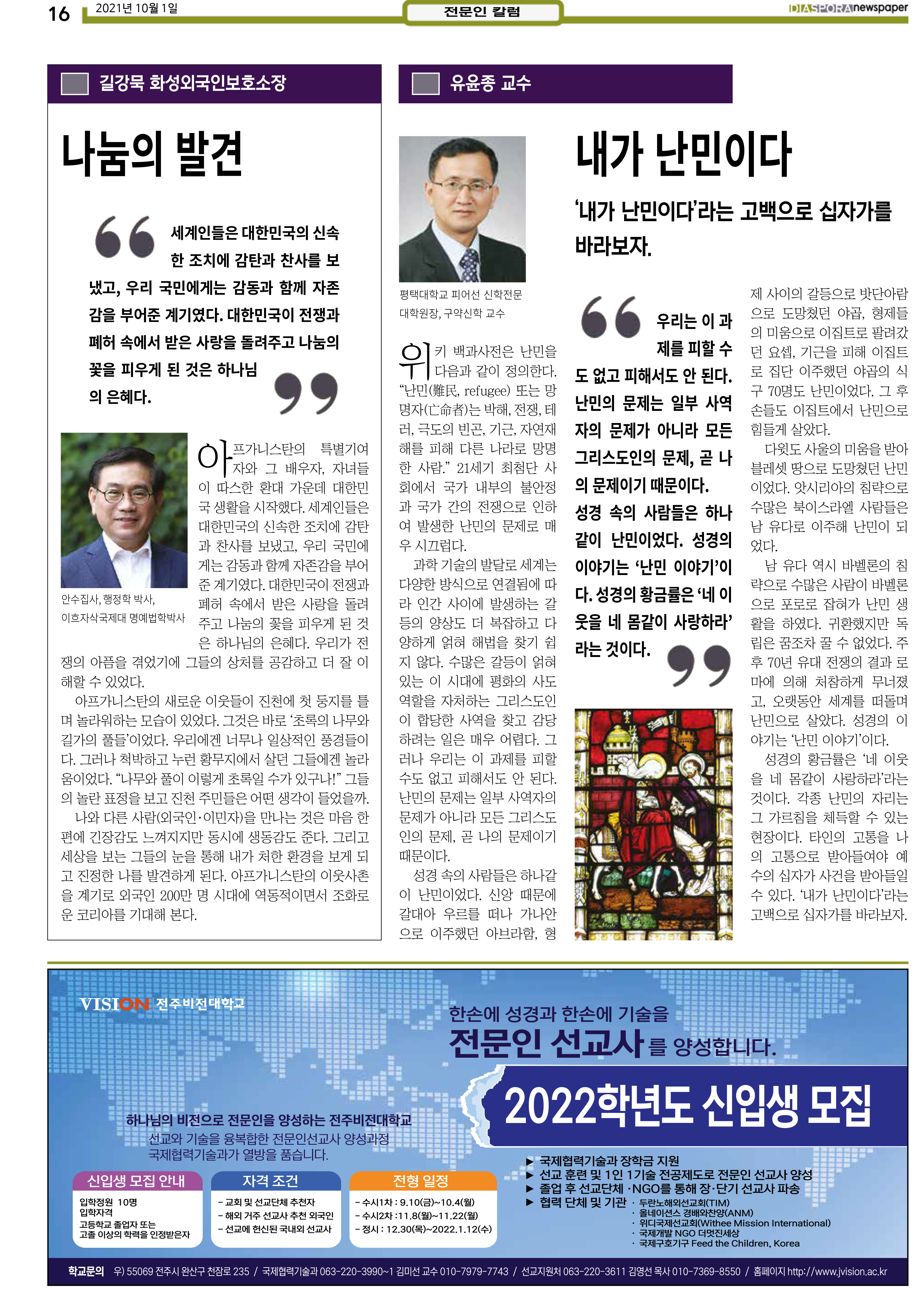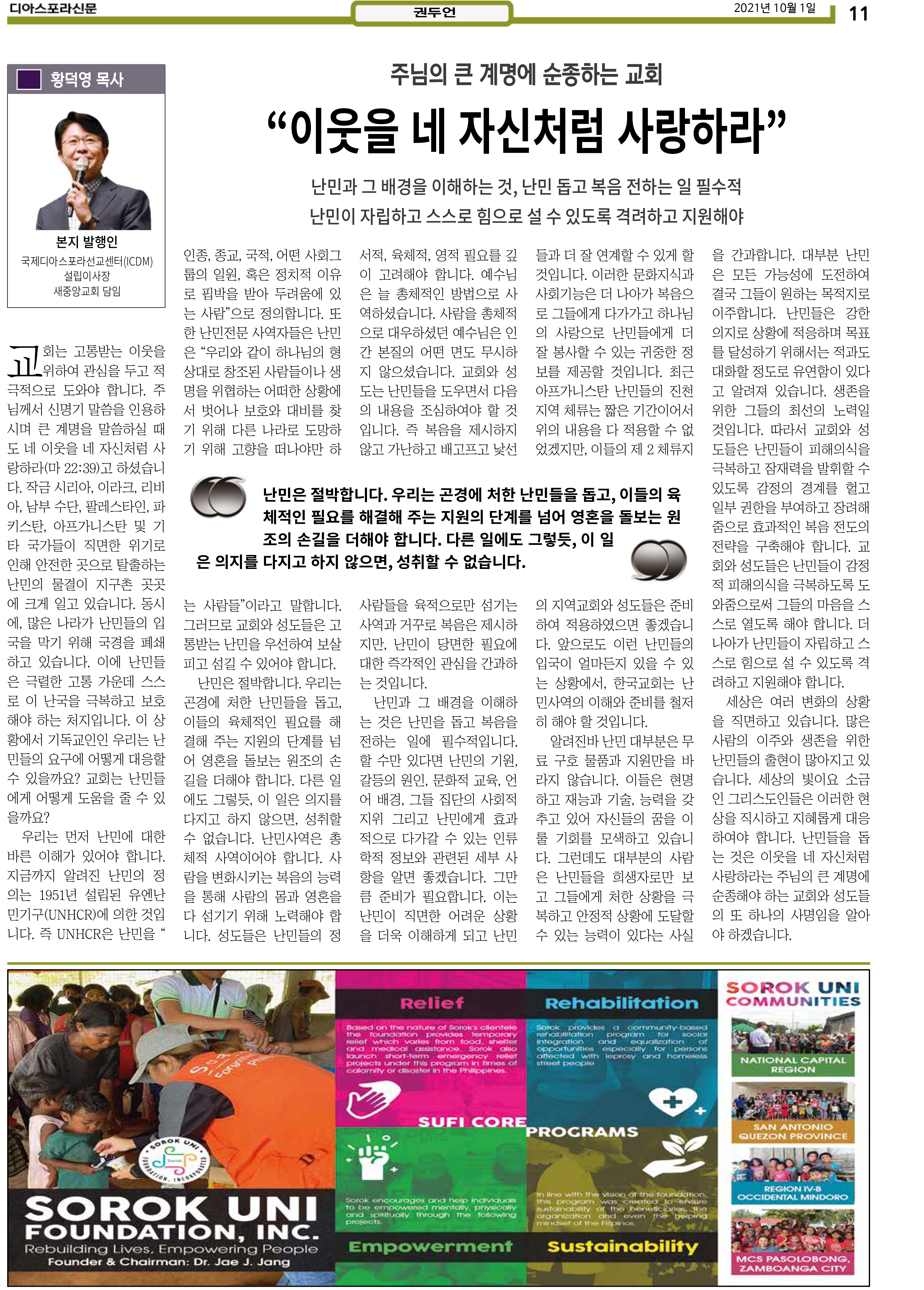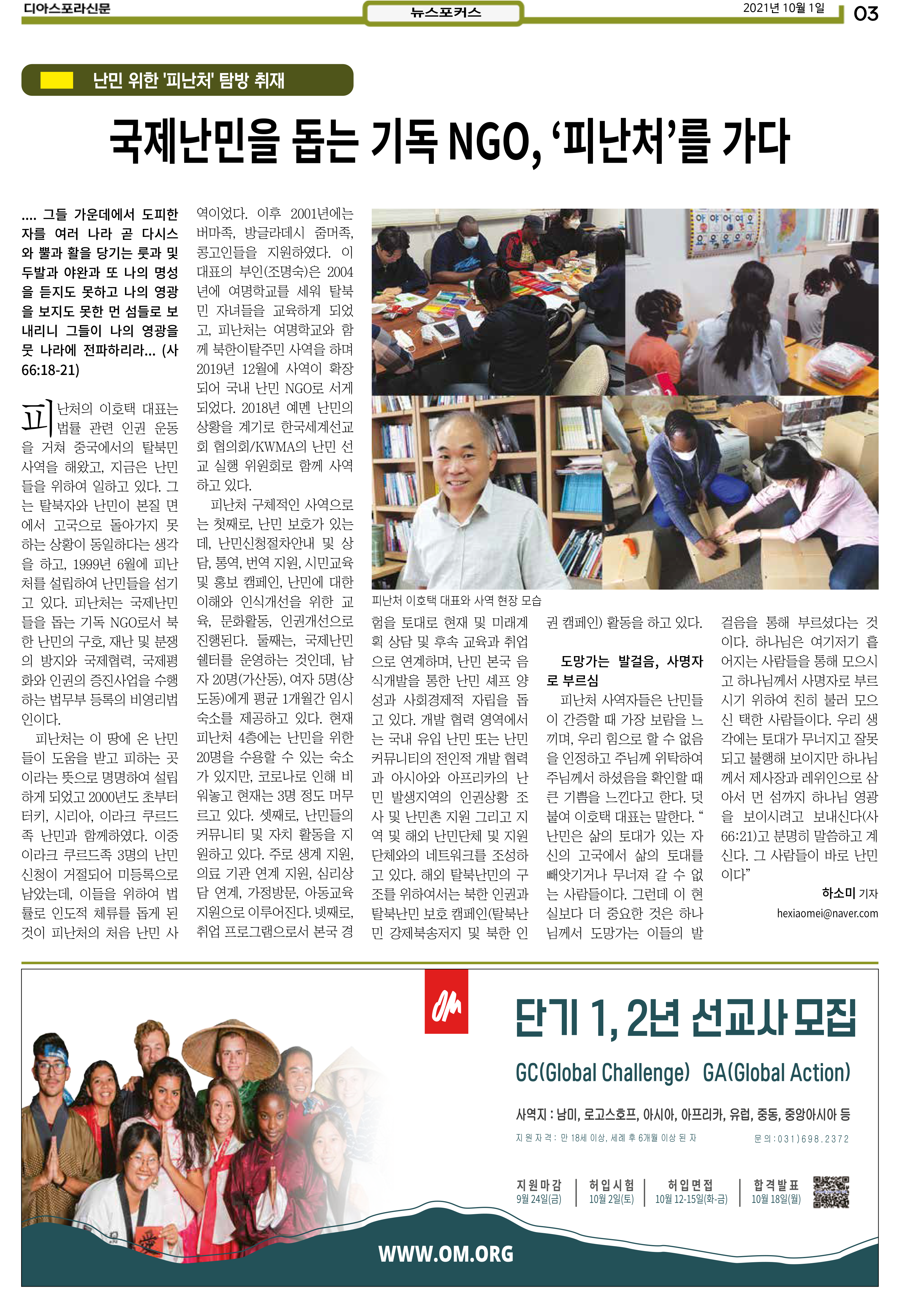 공지 [디아스포라신문] 제 4 호_2021년 10월_고국을 떠나야 했던 사람들, '난민' 위디국제선교회1 2021. 10. 14. 20:33 제 4 호_2021년 10월_고국을 떠나야 했던 사람들, '난민' www.diasporanews.kr 저작자표시 비영리 (새창열림)